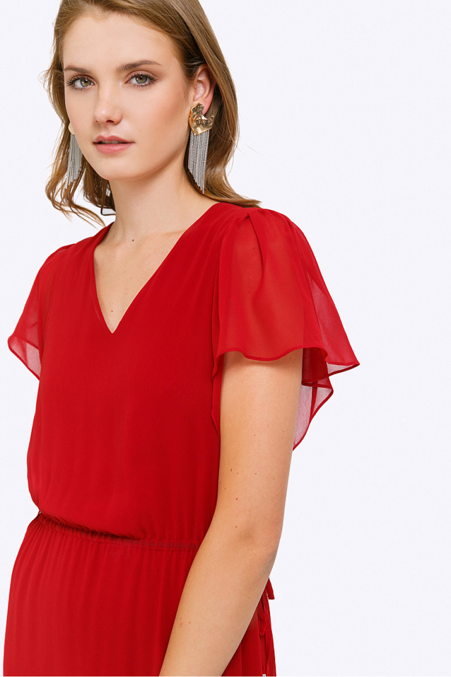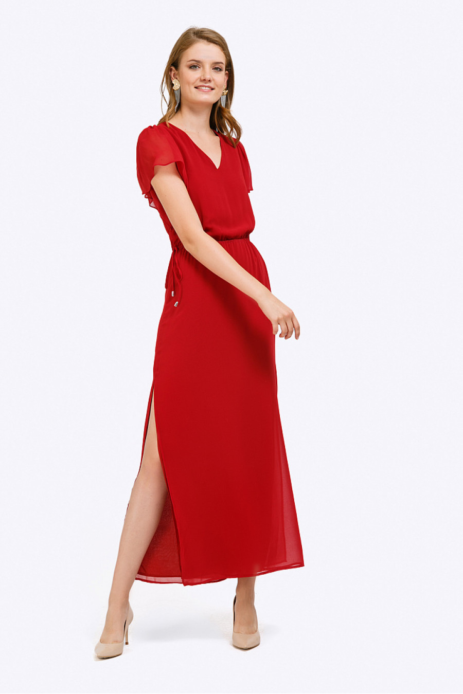 полупрозрачного полиэстера. Модель прямого силуэта, свободно облегает фигуру. ИмеетV-образный вырез горловины, короткие рукава в форме струящейся оборки. Линия талииобозначена кулиской с узким шнурком, регулирующимся на боку. Юбка с двумя высокимиразрезами в районе боковых швов.