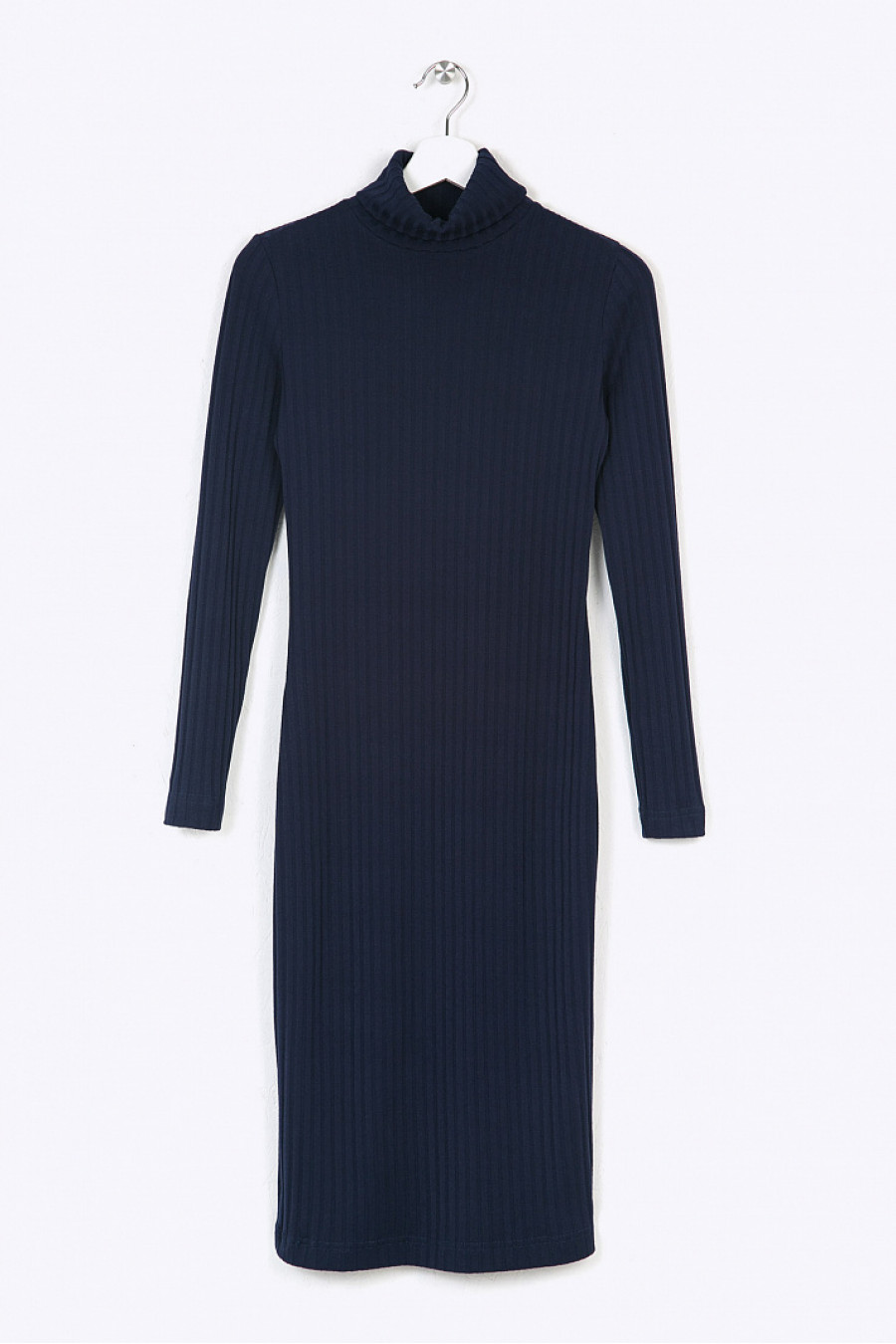 Тёмно-синее платье-миди с длинными рукавами и высоким воротником