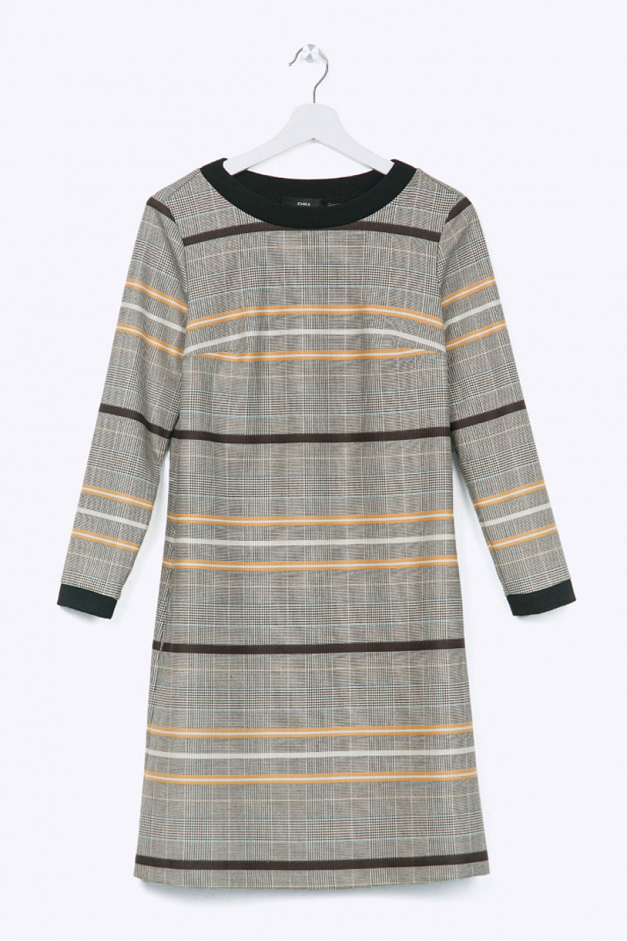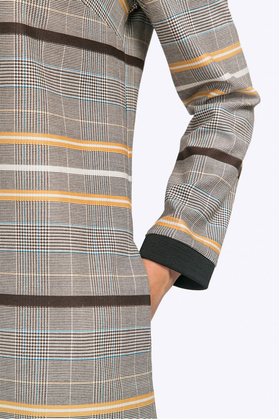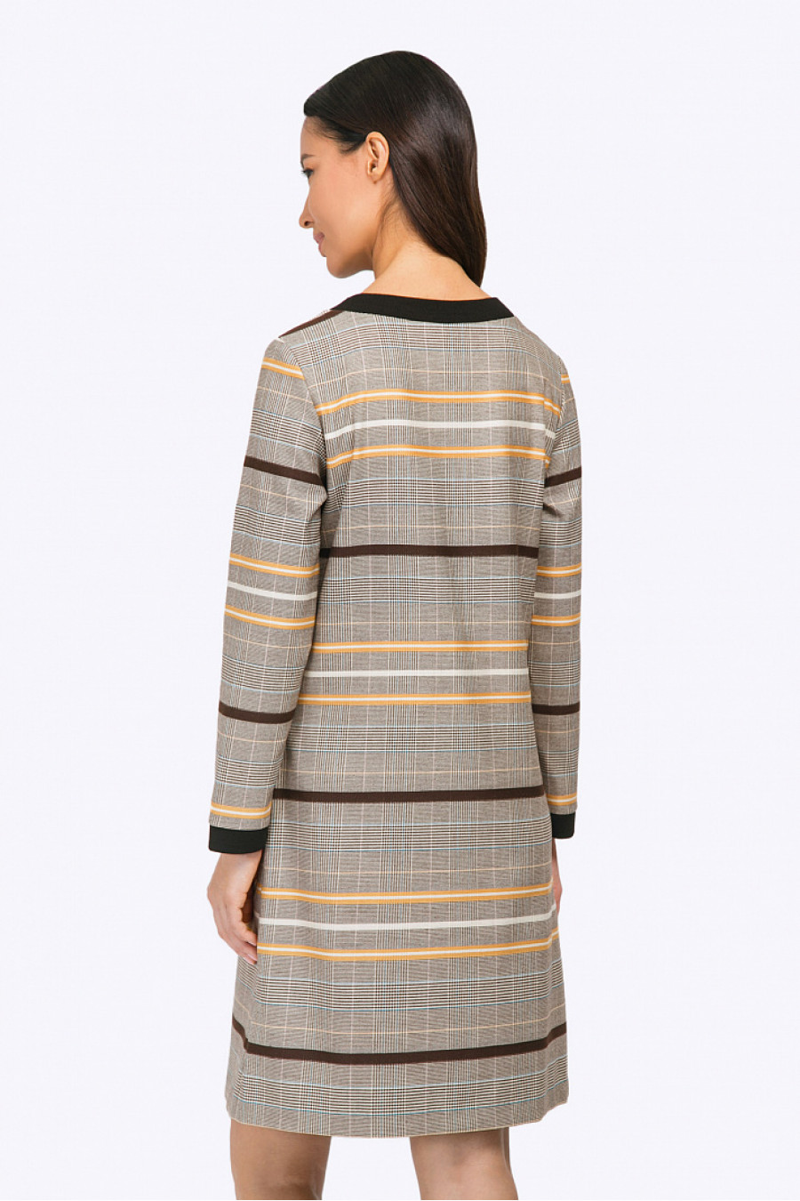 Строгое платье прямого силуэта с длинными рукавами. Выполнено изкостюмной ткани тёплых бежево-коричневых оттенков с орнаментом «клетка принца