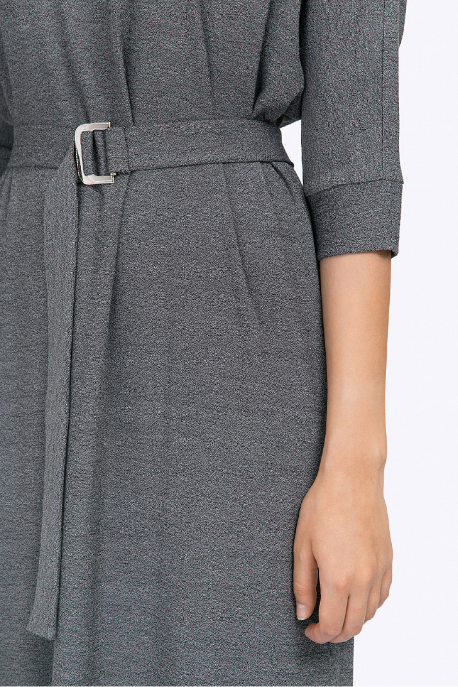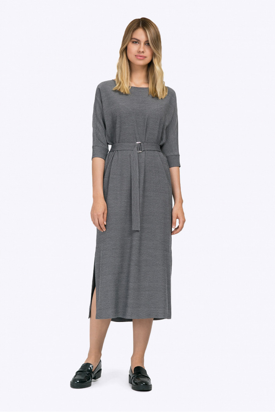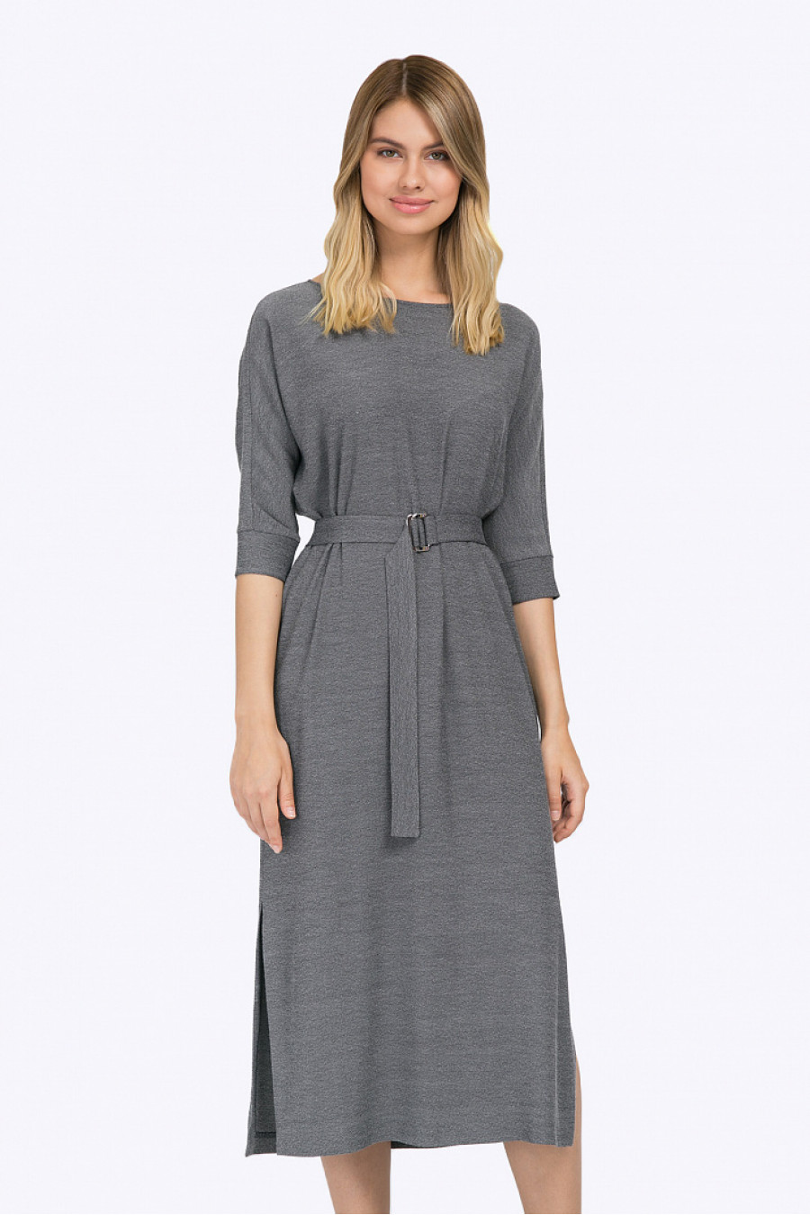 Серое платье-миди из поливискозы с меланжевым эффектом. Модель имеетпрямой крой и свободное облегание, круглый вырез горловины. Цельнокроеные рукава ¾декорированы вставкой и широкими манжетами. По бокам платья имеются высокиеразрезы, линия талии подчёркнута поясом с металлической пряжкой. Рост фотомодели 177 см.