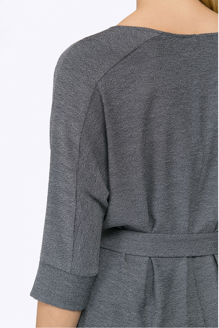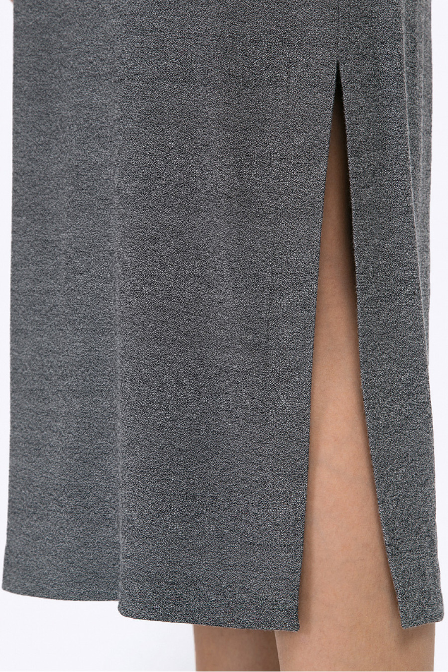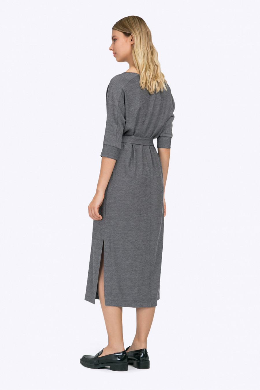 Серое платье-миди из поливискозы с меланжевым эффектом. Модель имеетпрямой крой и свободное облегание, круглый вырез горловины. Цельнокроеные рукава ¾декорированы вставкой и широкими манжетами. По бокам платья имеются высокиеразрезы, линия талии подчёркнута поясом с металлической пряжкой. Рост фотомодели 177 см.