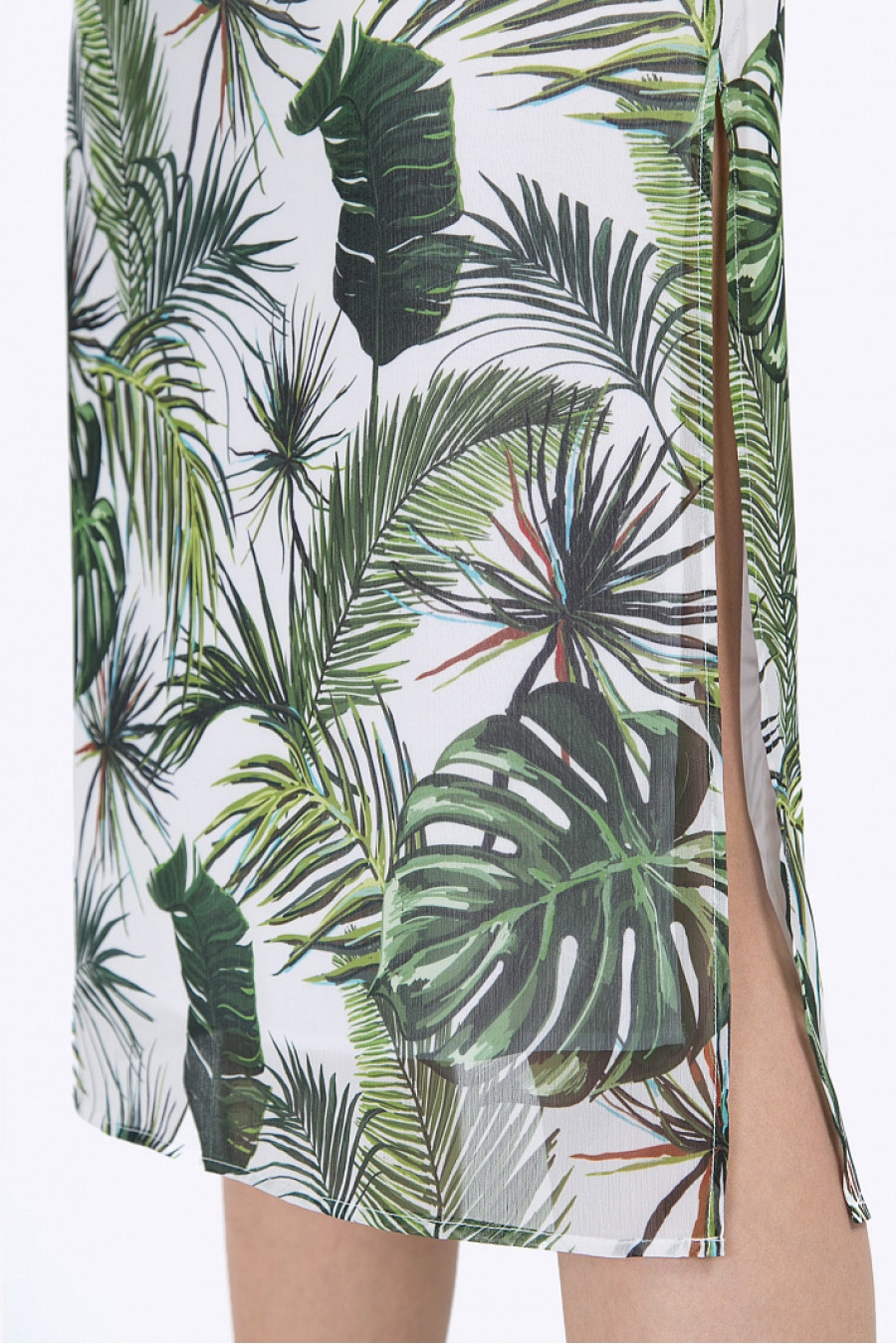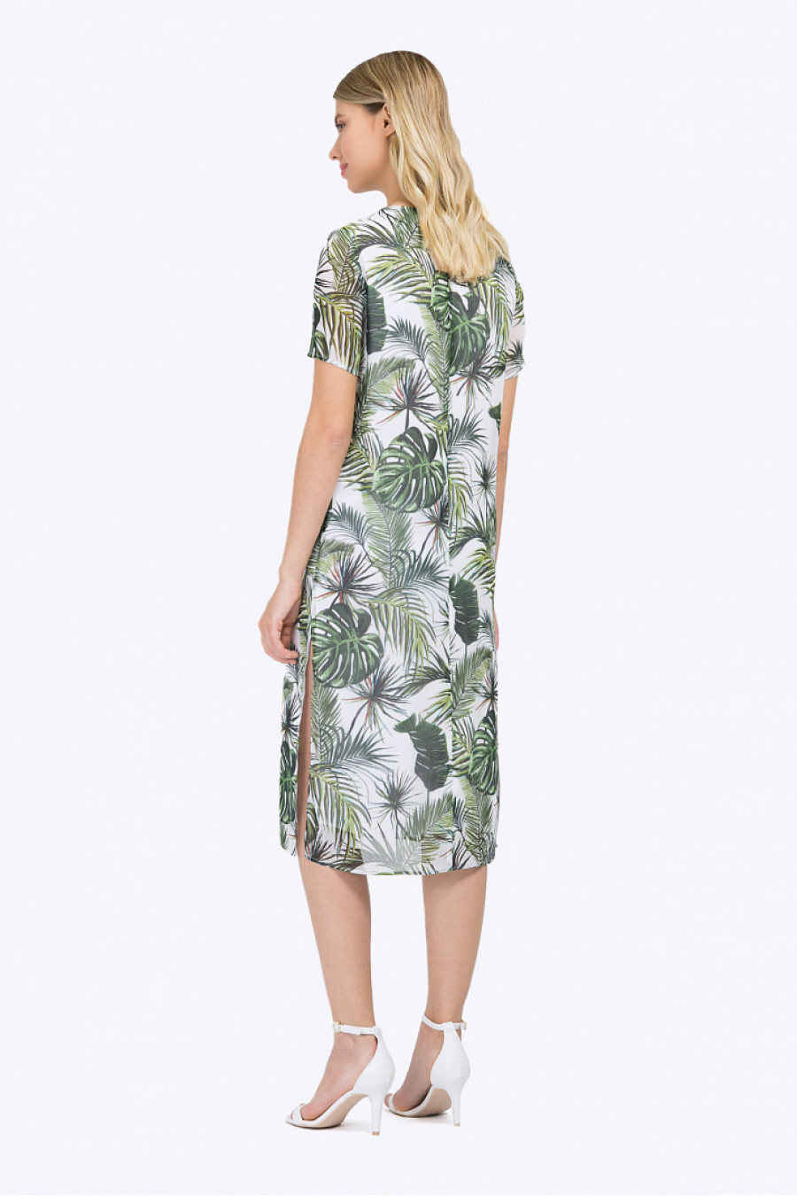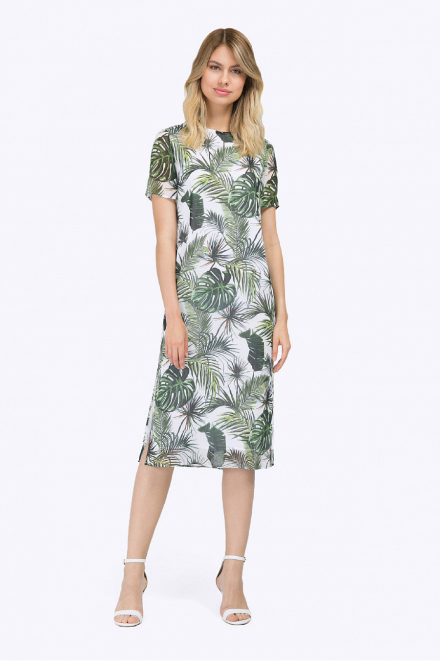 Летнее платье-миди с короткими рукавами. Модель имеет свободного облегания силуэт,круглый вырез горловины с застёжкой-молнией, разрезы по бокам. Украшением служитнасыщенный растительный орнамент приглушённых тёплых оттенков с изображениемтропических зарослей, укрывающих от полуденного зноя. Рост фотомодели 177 см.