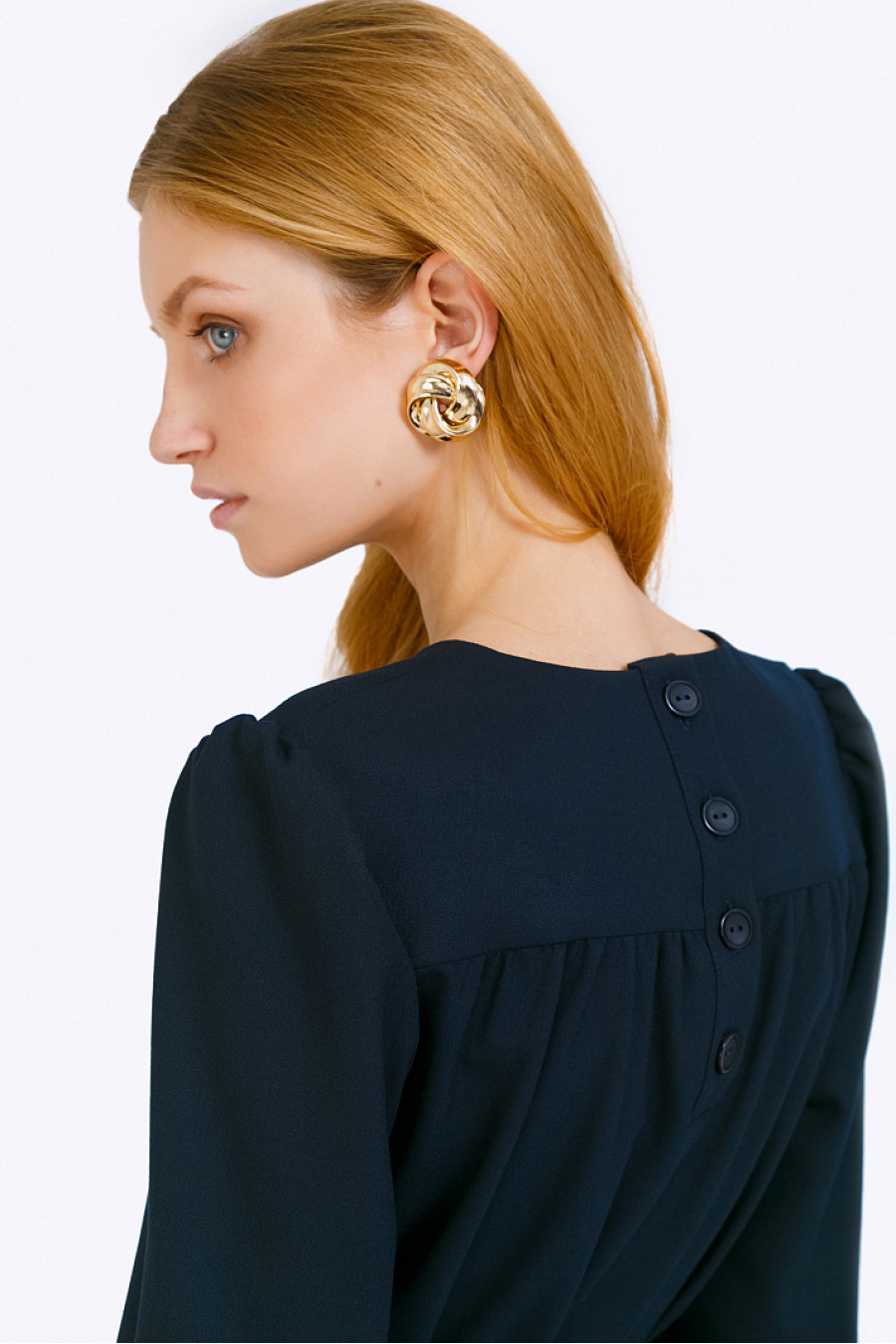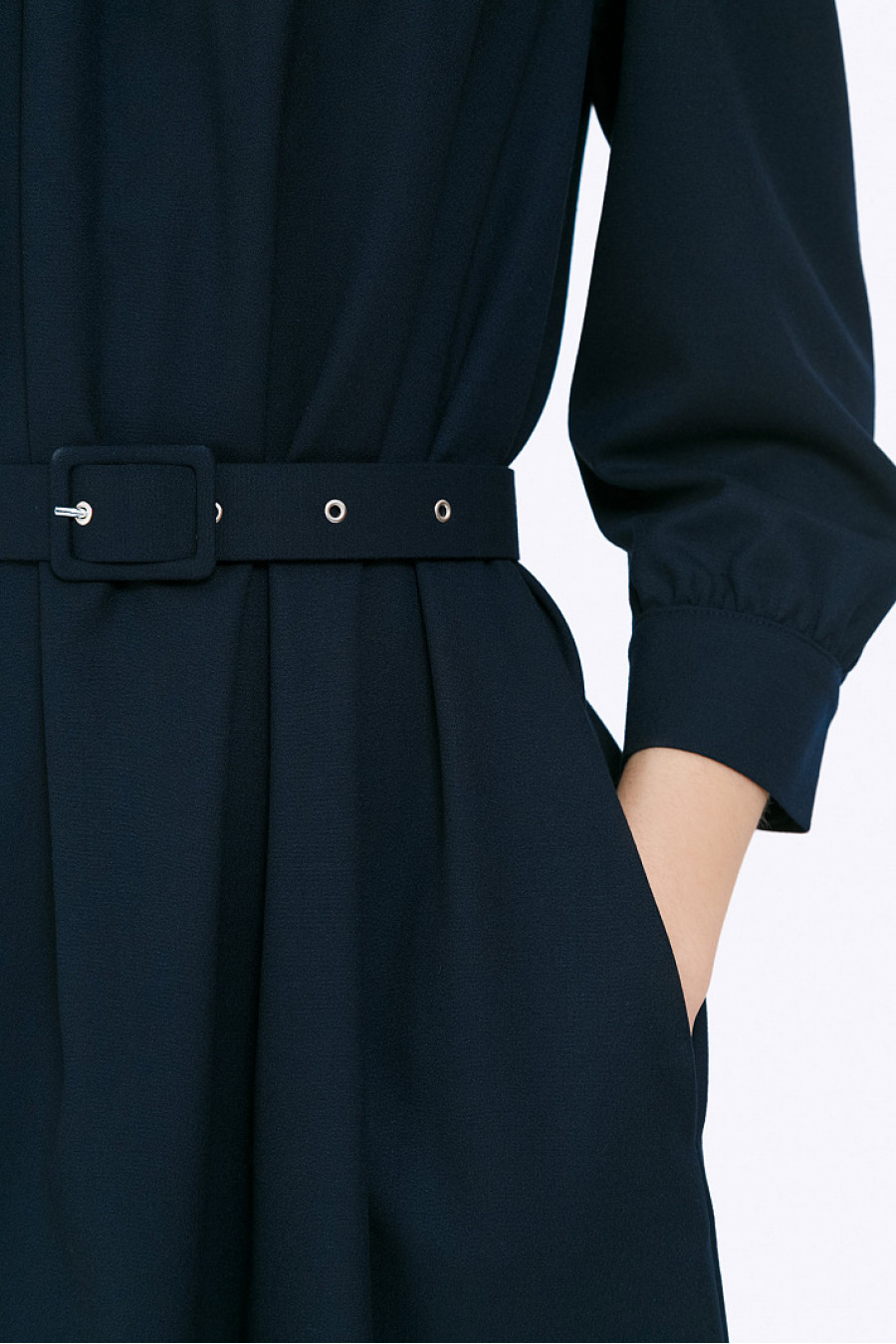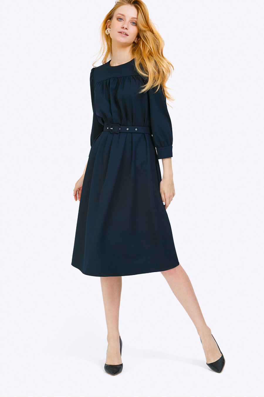 Тёмно-синее платье-миди с плавными женственными линиями для деловых
