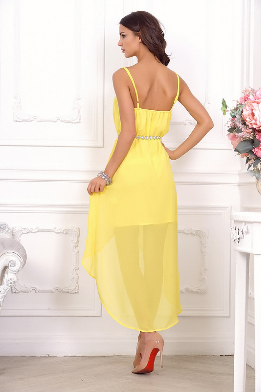 Стильное желтое платье с ремешком. Асимметричный крой подола придаст образу легкость и романтичность.