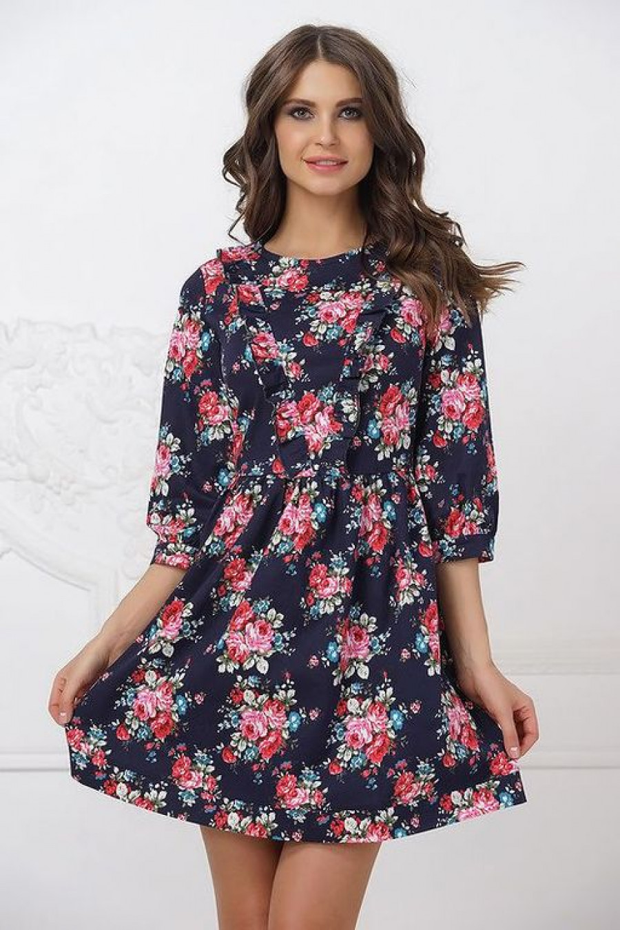 Летнее платье с рукавом 3/4 и Округлым вырезом горловины. Выполнено из 100% натурального хлопка. Модель выполнена в нежном цветочном принте и стиле Беби Долл. Бэби долл является весьма популярным у молодых девушек стилем одежды. Наряды в таком стиле выглядят мило и кокетливо, придавая хрупкости и изящества их обладательницам. Допускается машинная стирка в бережном режиме при 30-40 градусах или вручную.