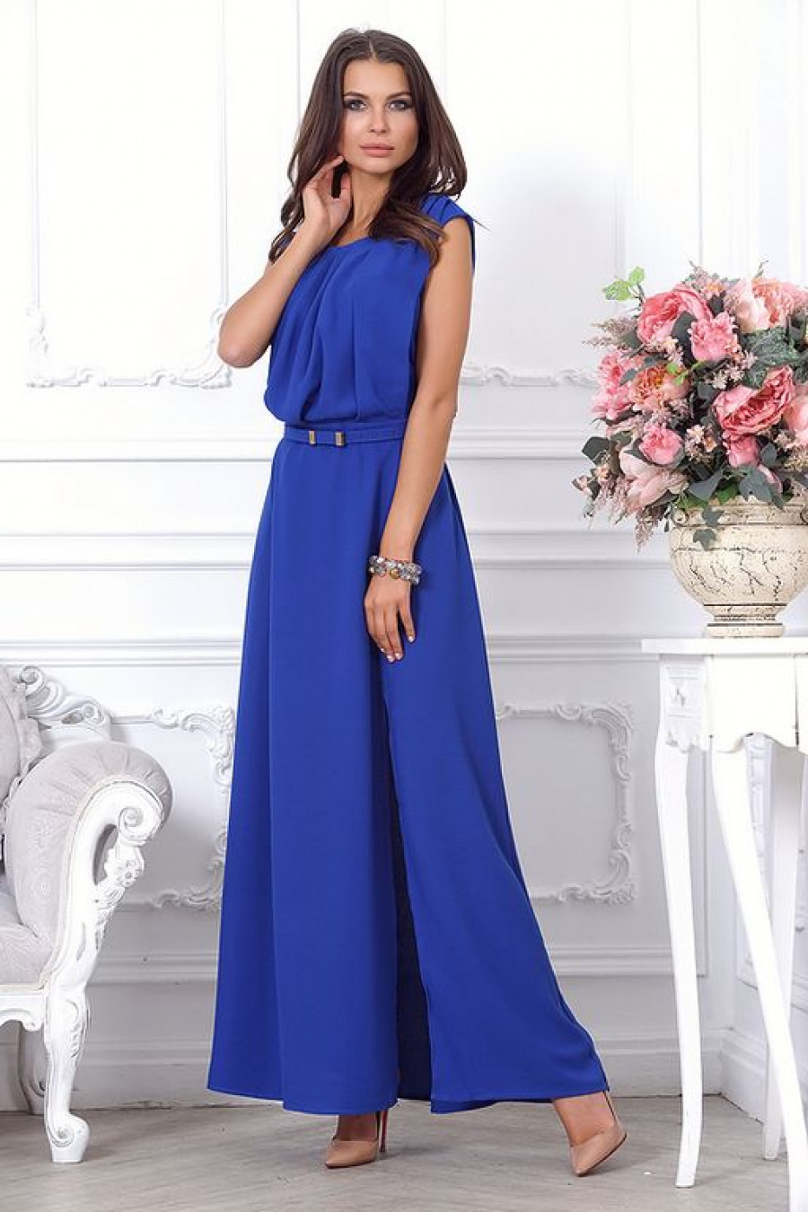 Вечернее длинное платье с разрезом. Вырез изделия неглубокий, круглой формы. Платье без рукавов, с классическими средними проймами. Модель приталенного кроя, свободная, длинная, необлегающая. Лиф украшен сборками, образующими красивые многочисленные складки. Юбка прямая, свободная, длинная, ниспадающая, с зажимами по бокам. Платье украшено длинным боковым разрезом, придающим образу экстравагантность. В комплекте тонкий синий пояс с металлической фурнитурой, представленный на фото.