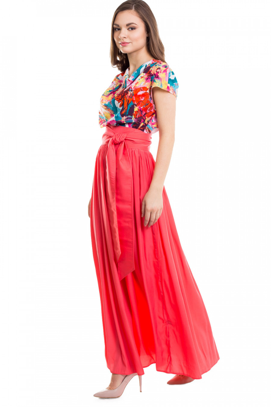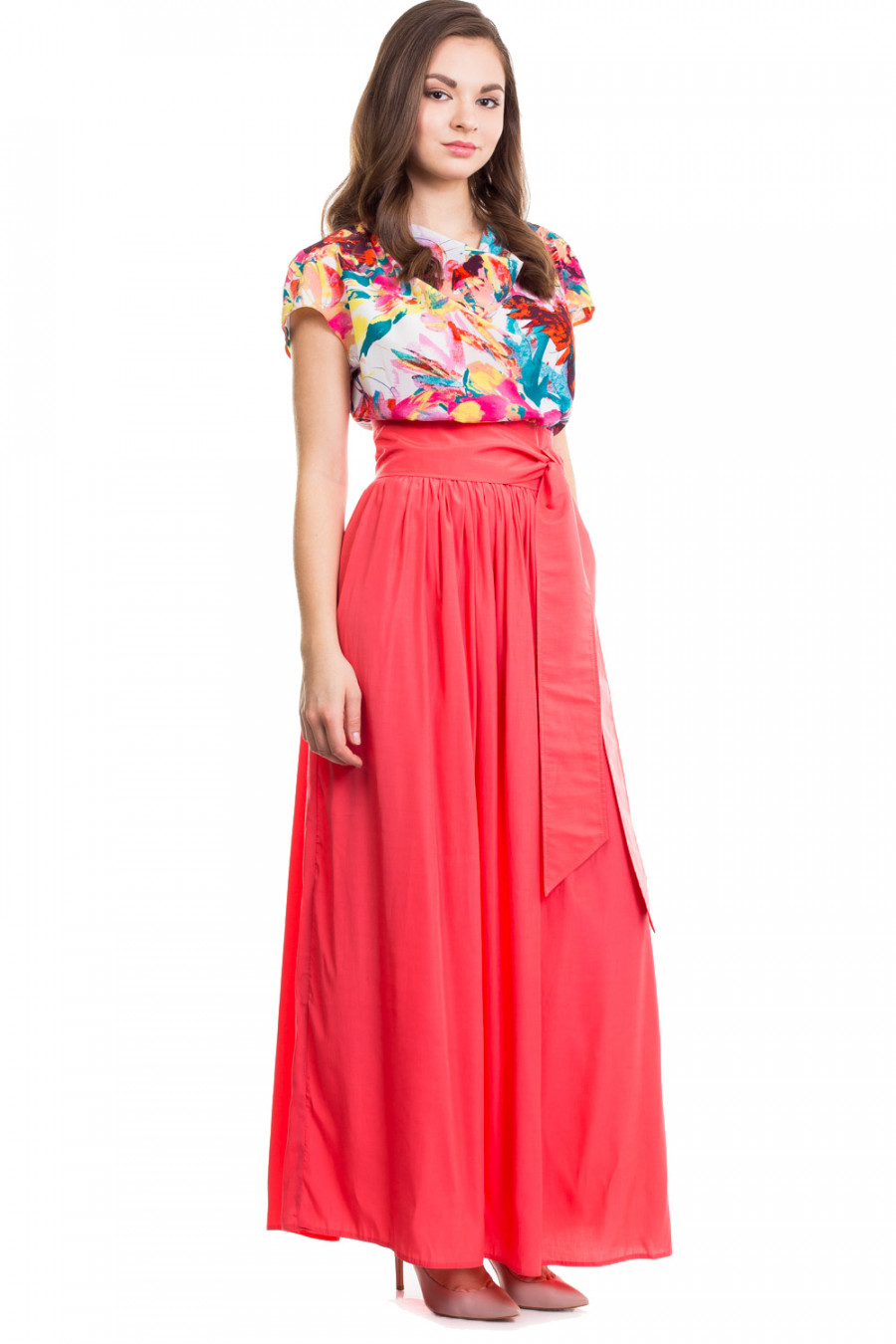 Платье с длинной юбкой-колоколом, с поясом на талии и ярким верхом с цветочным принтом.