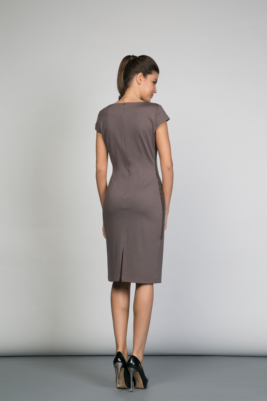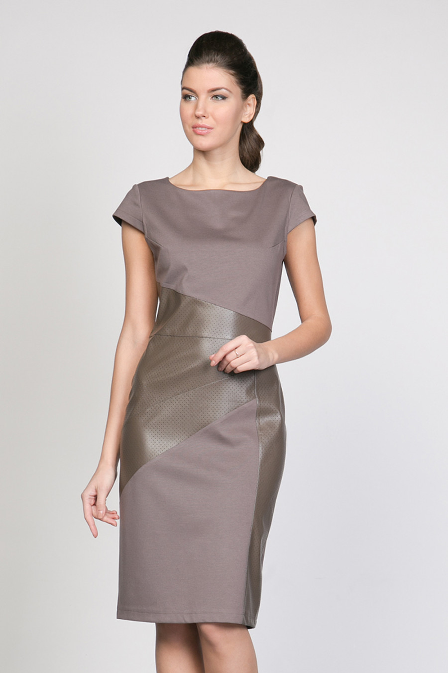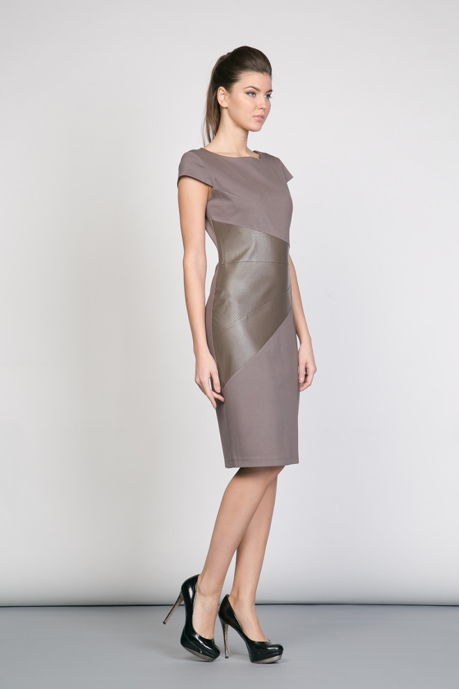 Облегающие платье с кожаной вставкой на талии, с коротким рукавом.