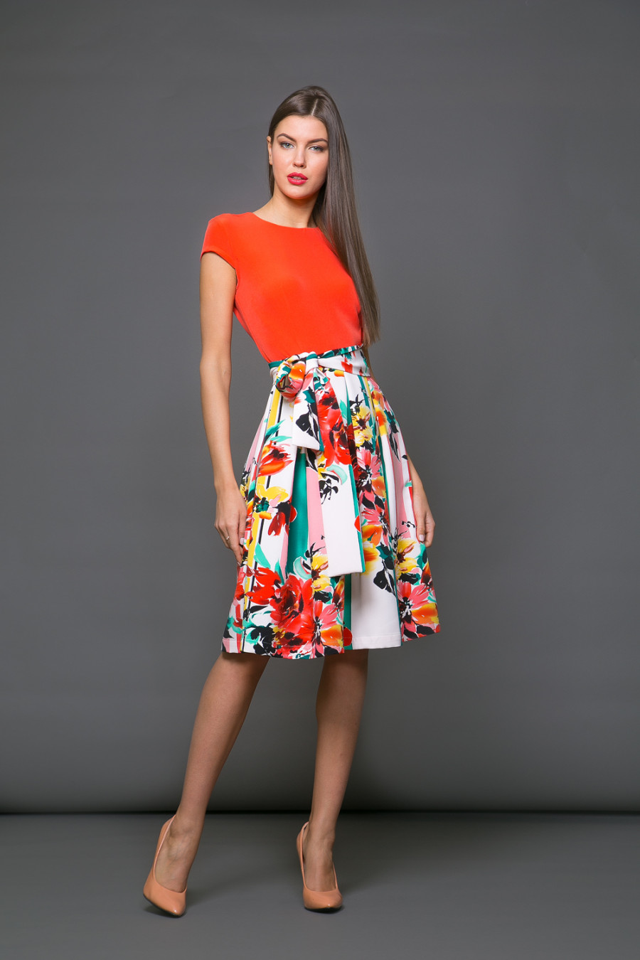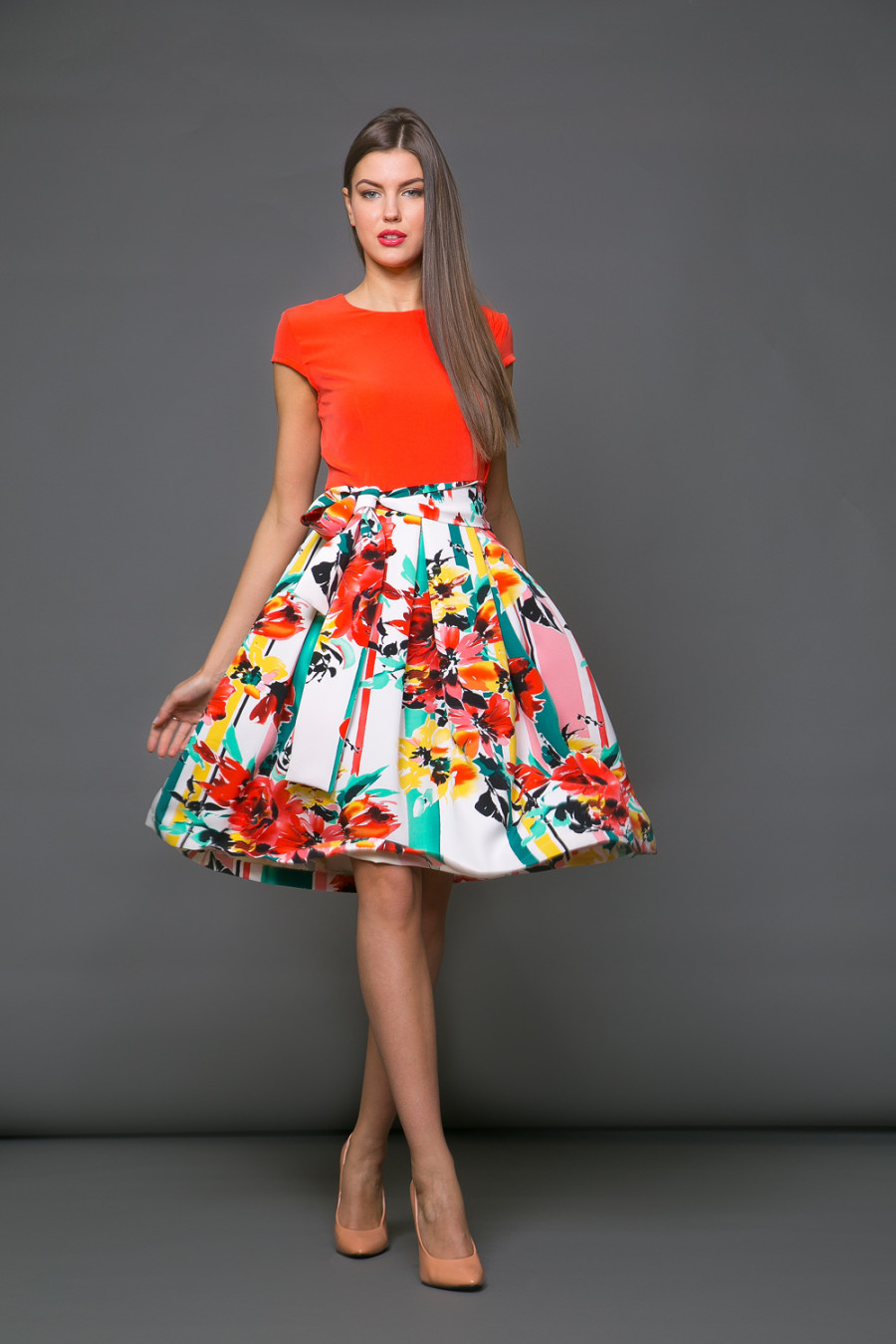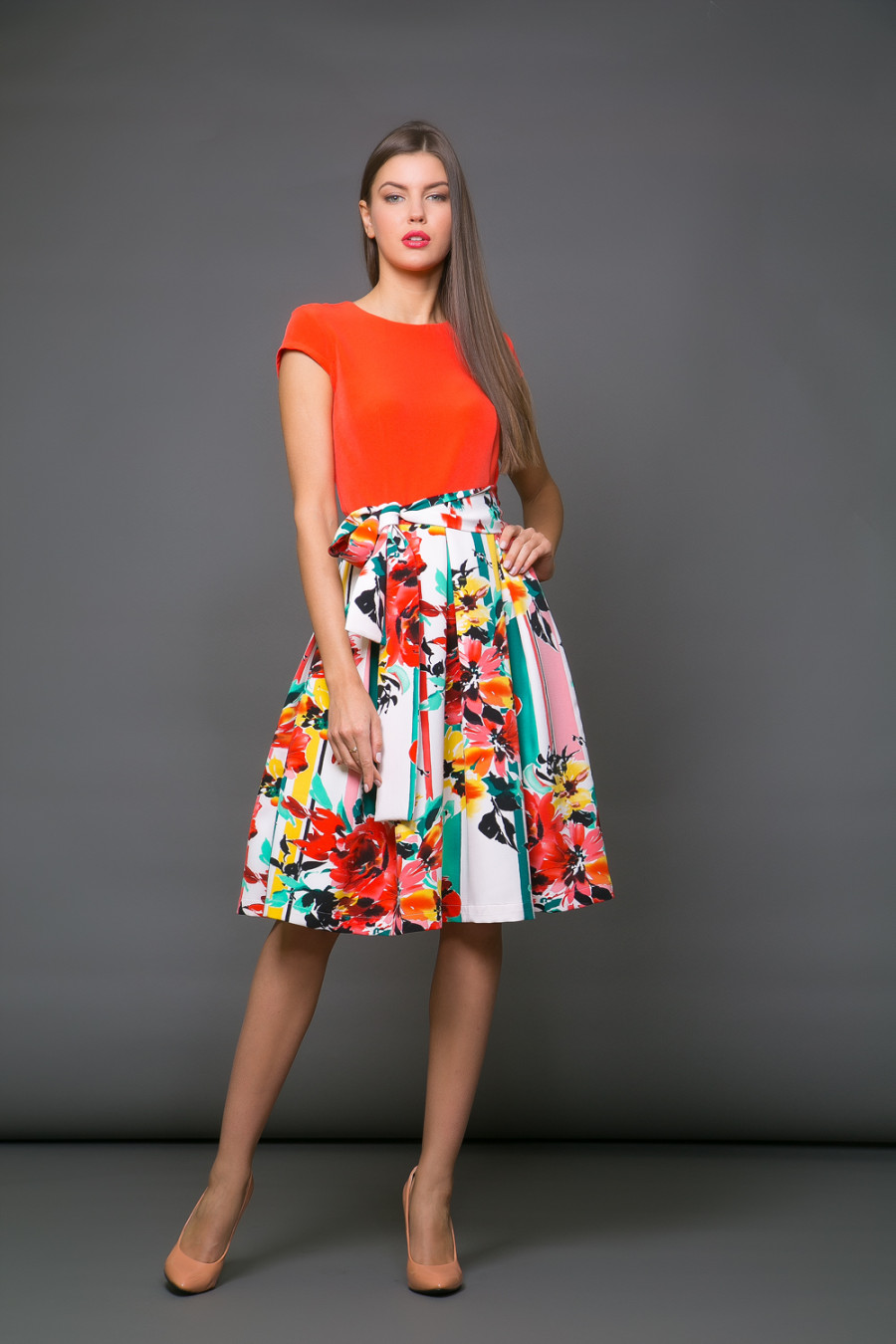 Платье с коротким рукавом и шикарной юбкой с ярким цветочным принтом. В нем вы точно не останетесь незамеченной.