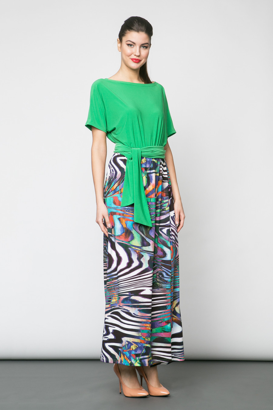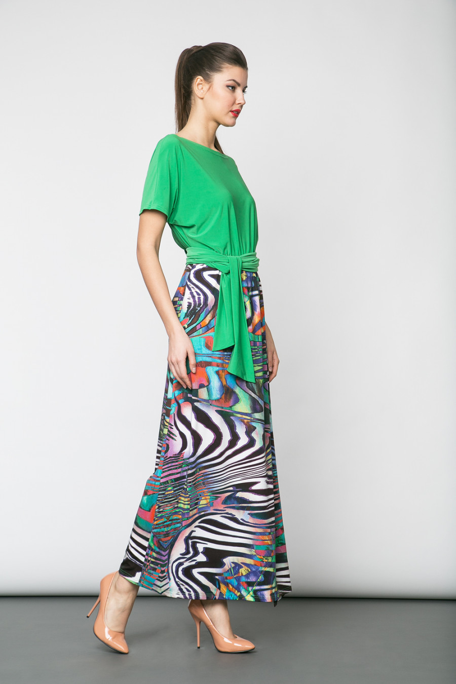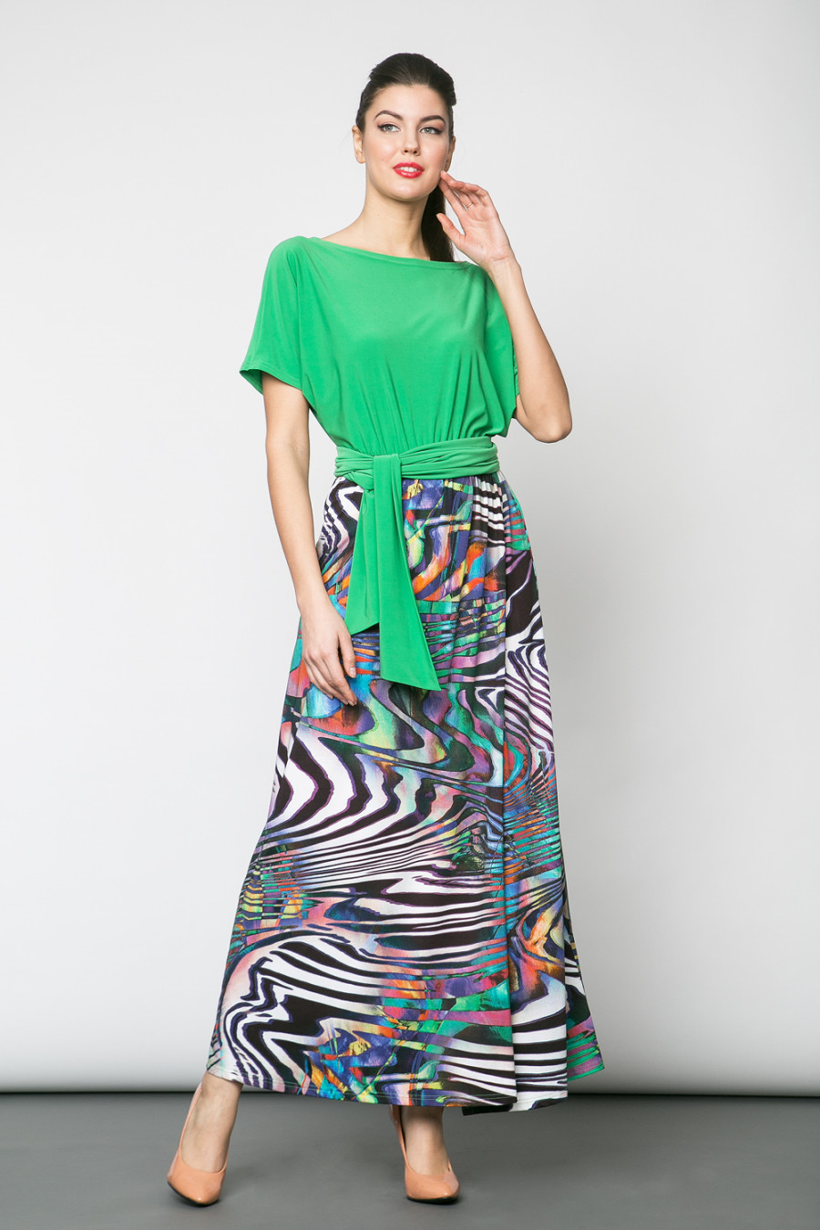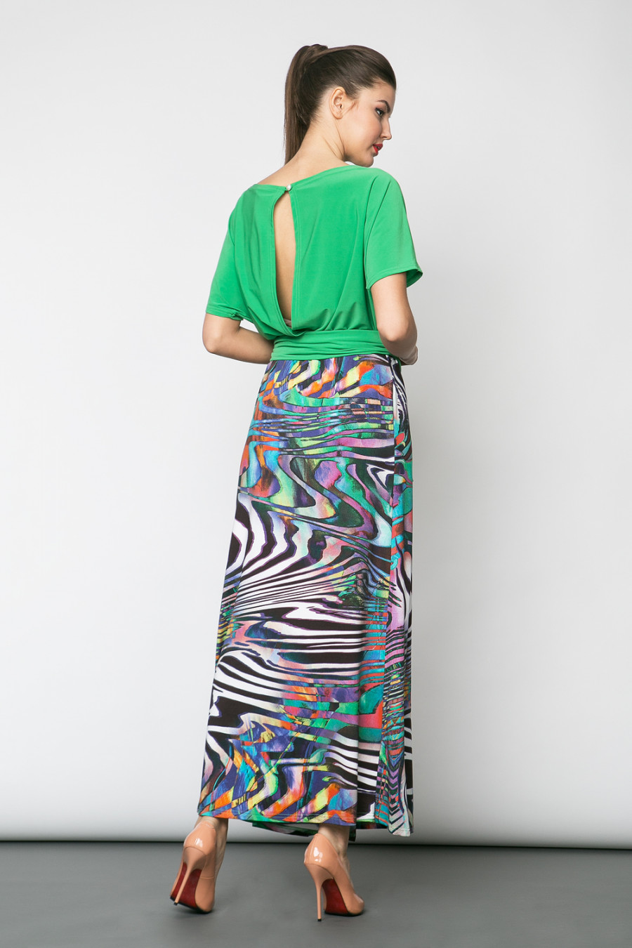 Длинное платье со свободной юбкой с цветочным принтом, с поясом на талии. Открытая спина.