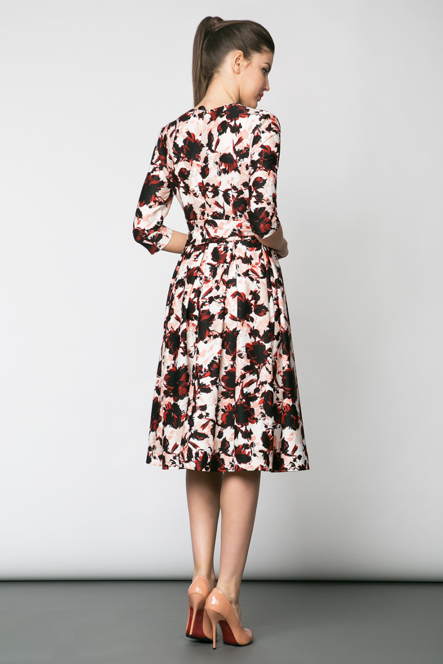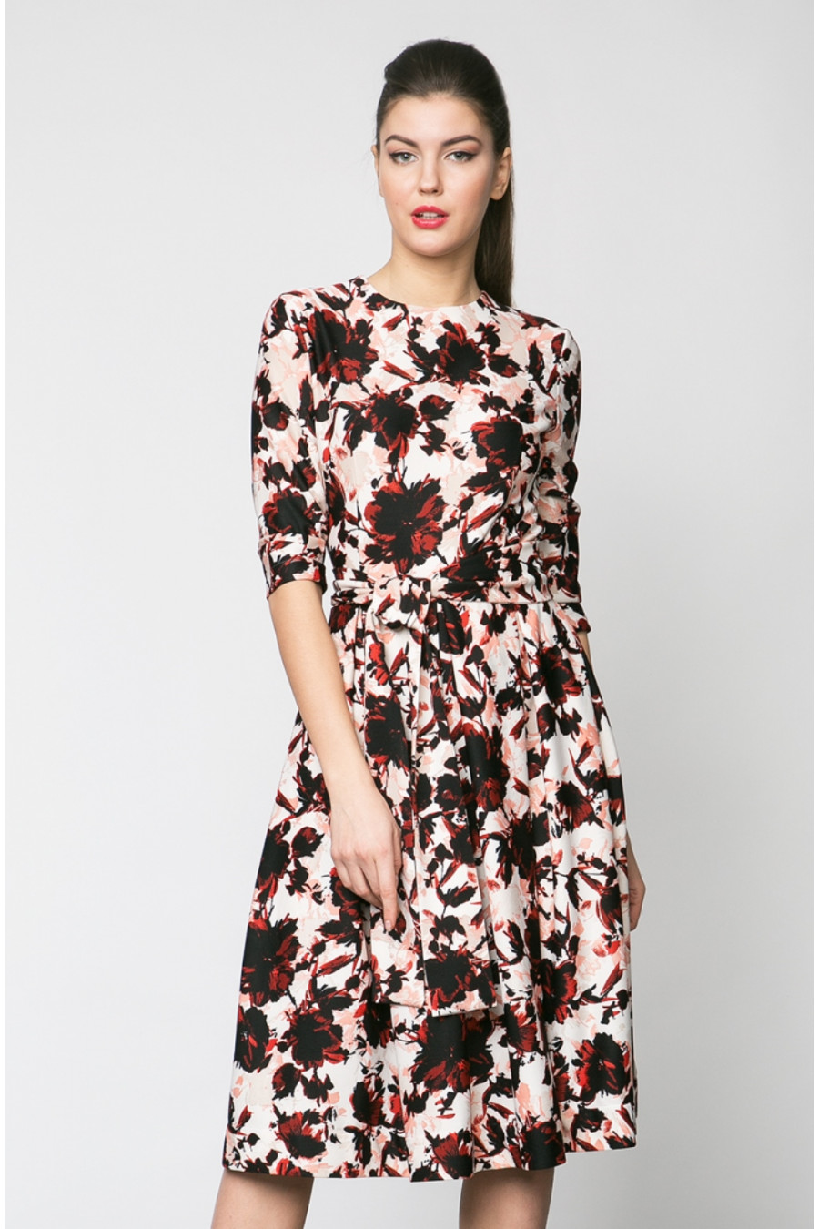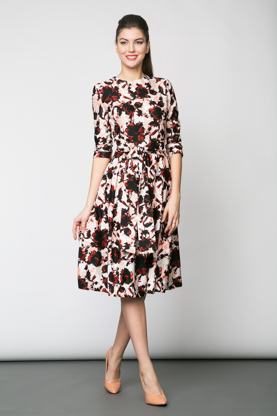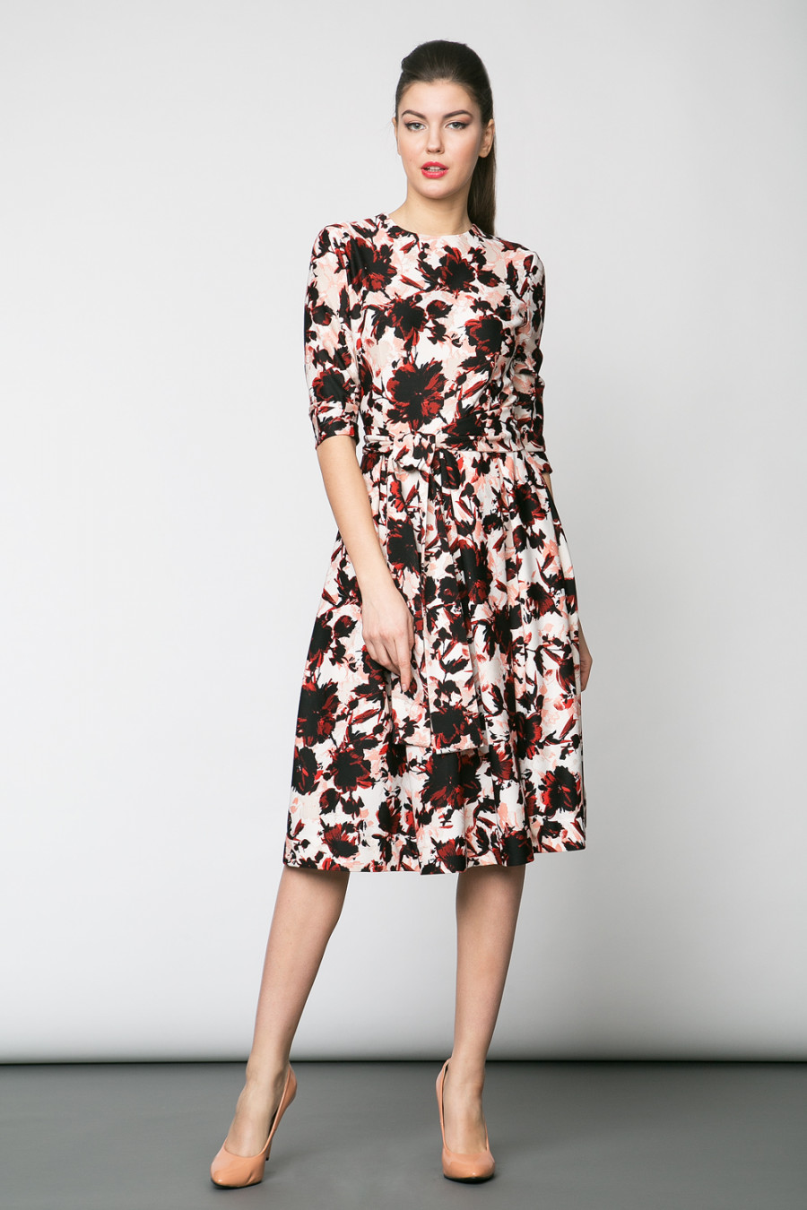 Платье ниже колена, с ярким поясом-узлом на талии, принт-"огурцы"