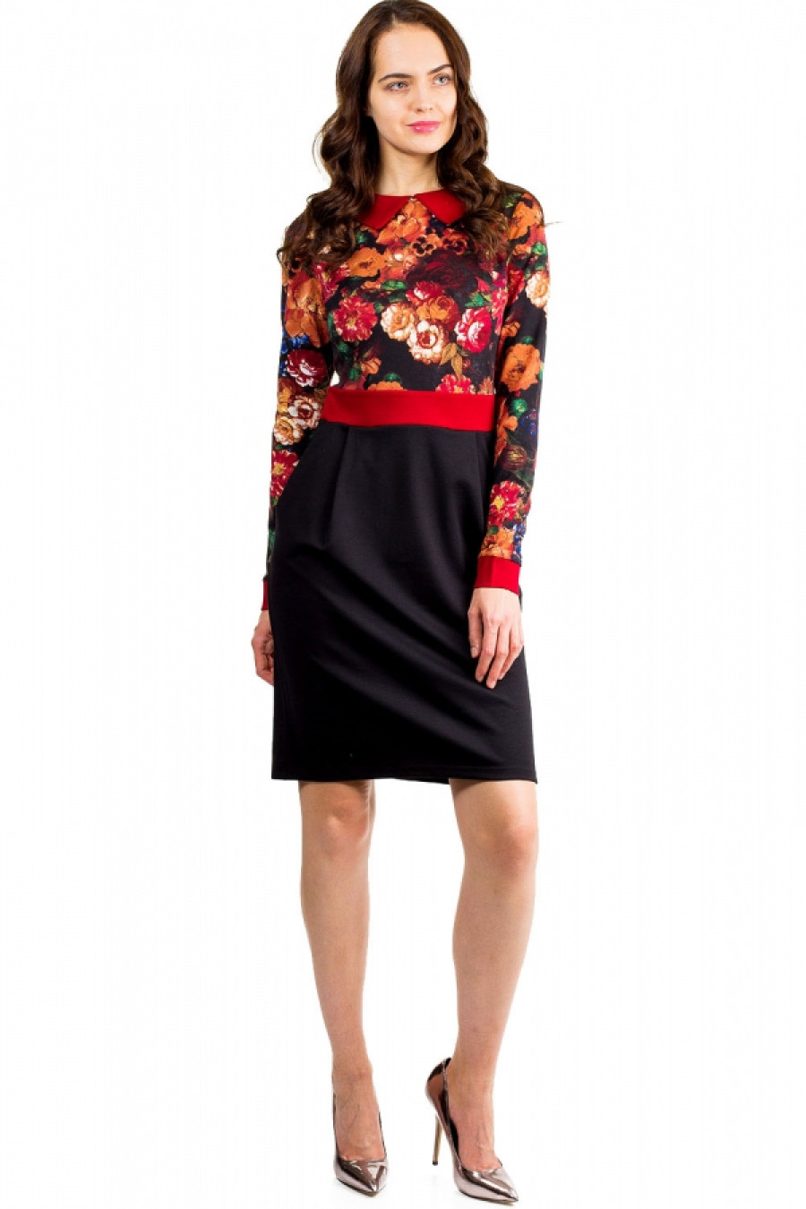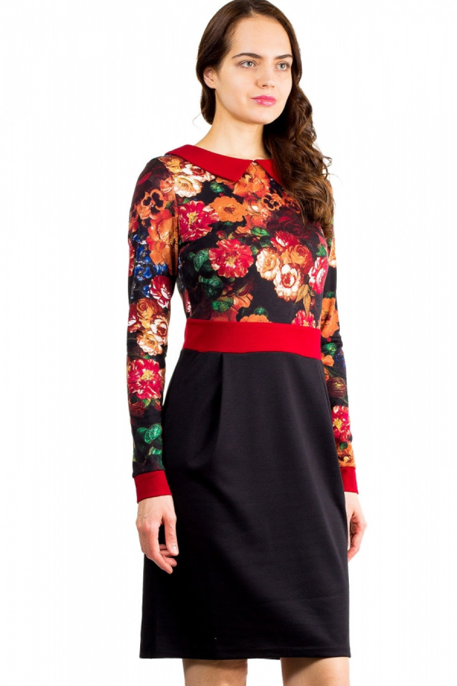 Великолепное платье приталенного силуэта поможет создать женственный образ. Модель с длинными рукавами и округлым вырезом горловины. Верх изделия оформлен изысканным цветочным принтом. Маломерит на один размер.