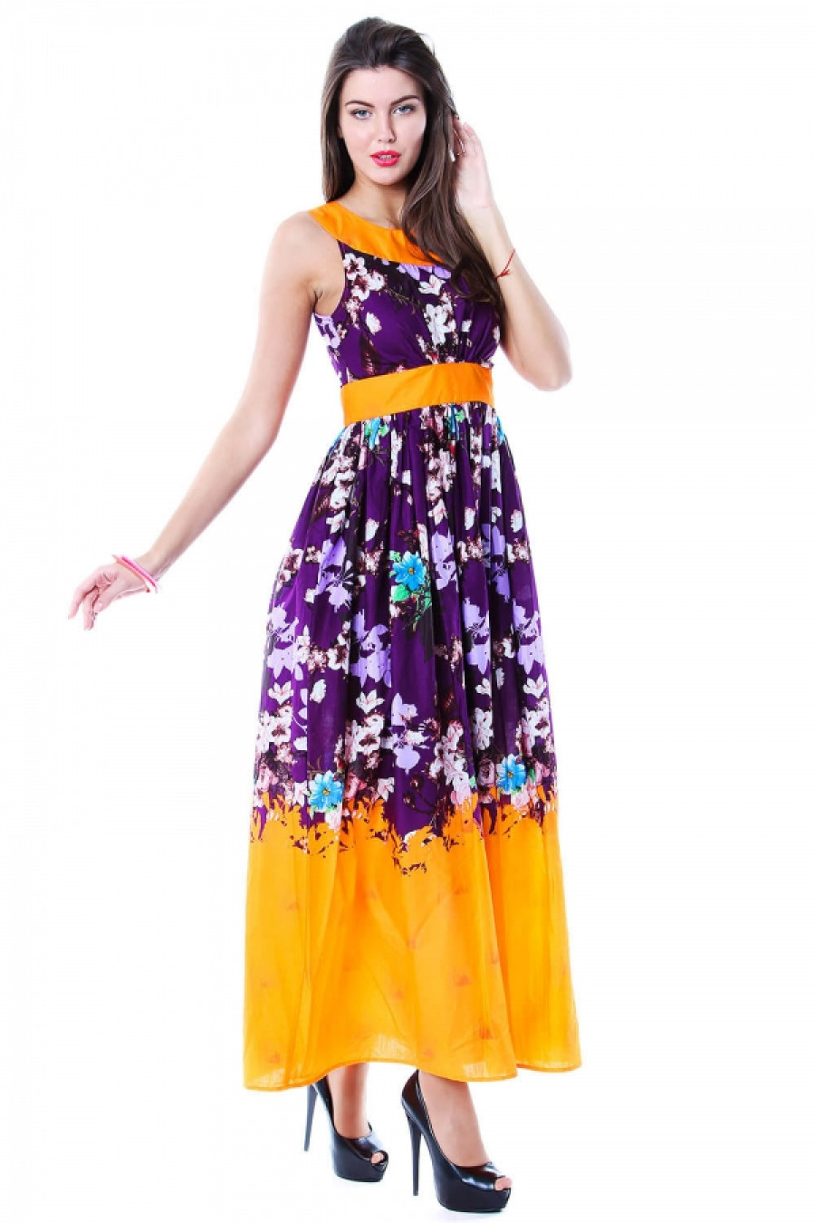 Яркое длинное платье. Модель оформлена красочным печатным рисунком. Идеальный летний вариант для создания жизнерадостных образов. Длина платья  138см.