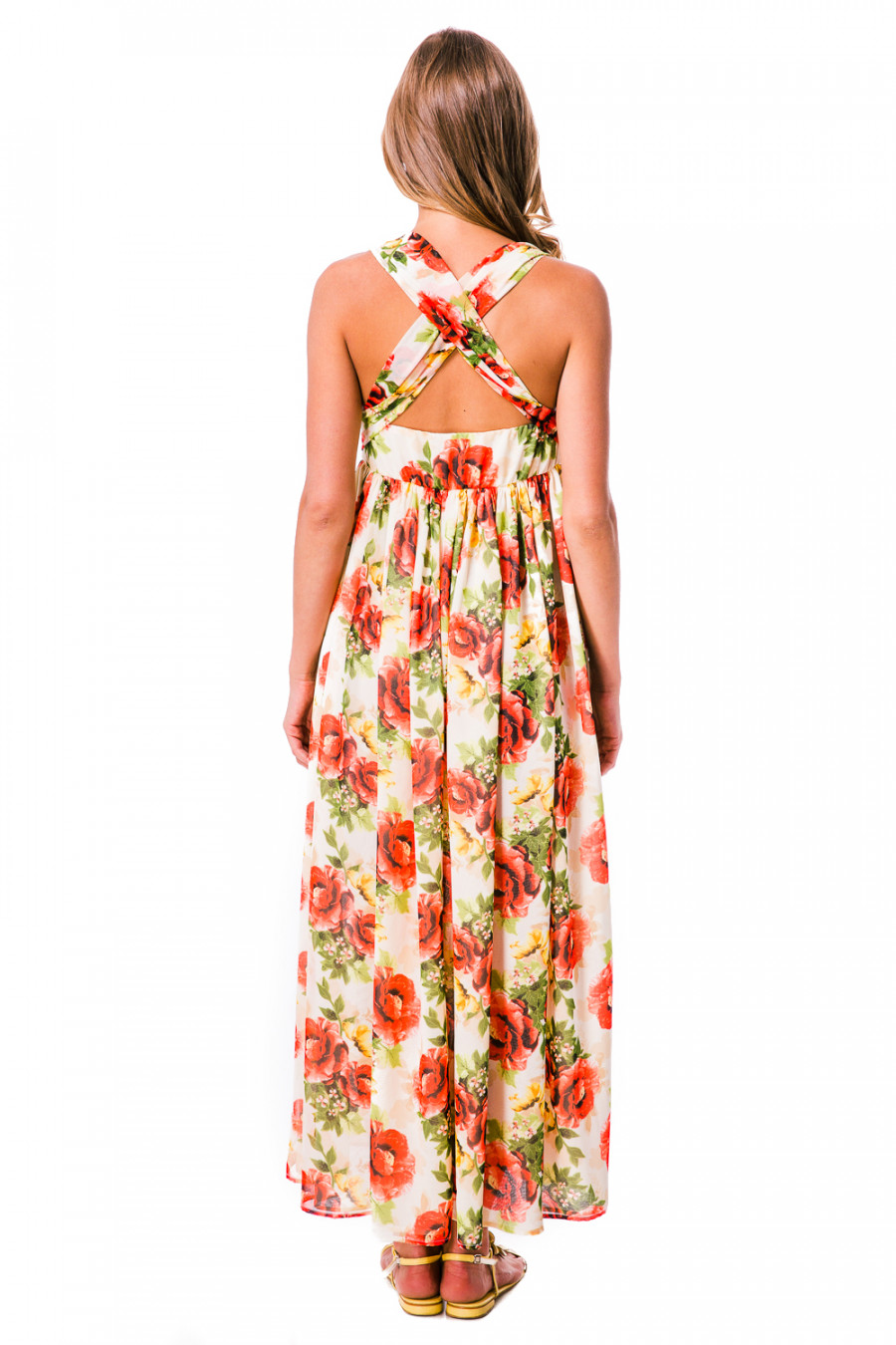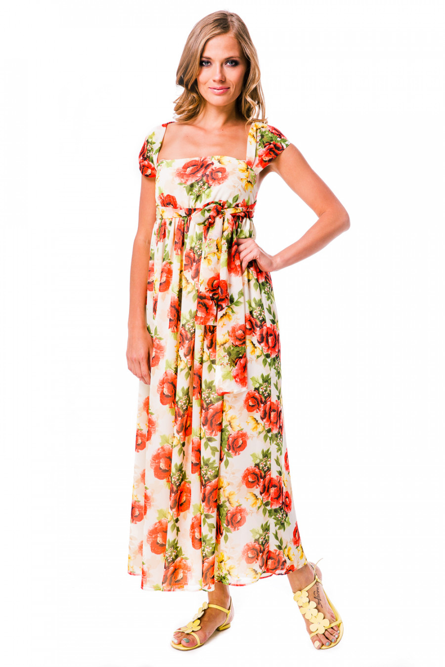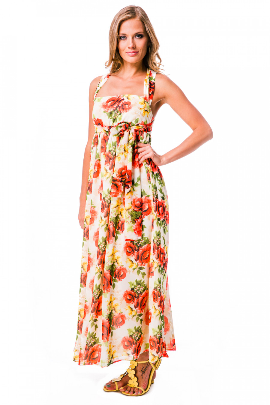 Замечательное летнее платье-сарафан. Модель оригинального дизайна, лиф выполнен из двойной ткани, юбка свободного покроя со сборками на лифе. Платье выполнено из качественного материала-шифон и украшенно ярким принтом. Модель фиксируется на широкие бретели. Возможно несколько вариантов завязывания. Подкладка. Модель займет достойное место в Вашем гардеробе.
