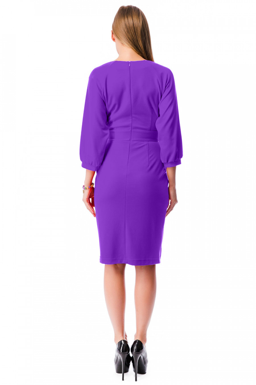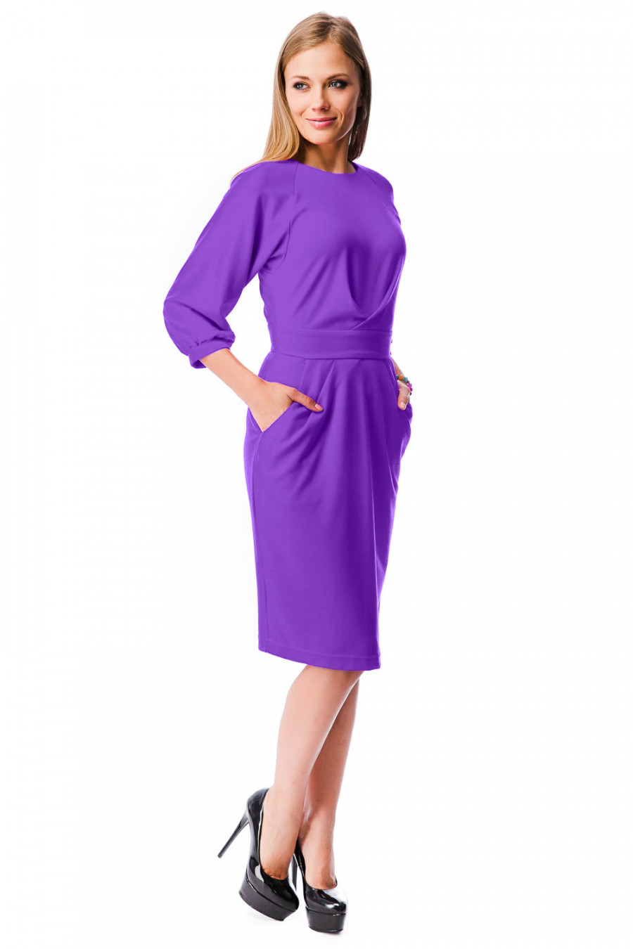Стильное платье приталенного силуэта. Модель с округлым вырезом горловины и укороченными рукавами-реглан. Манжет обработан небольшой сборкой. Талия разделена широким поясом. Платье декорировано складками от линии талии и карманами. Сзади-застежка на молнию. Модель выполнена из качественного материала насыщенной расцветки. Удобный и практичный вариант.