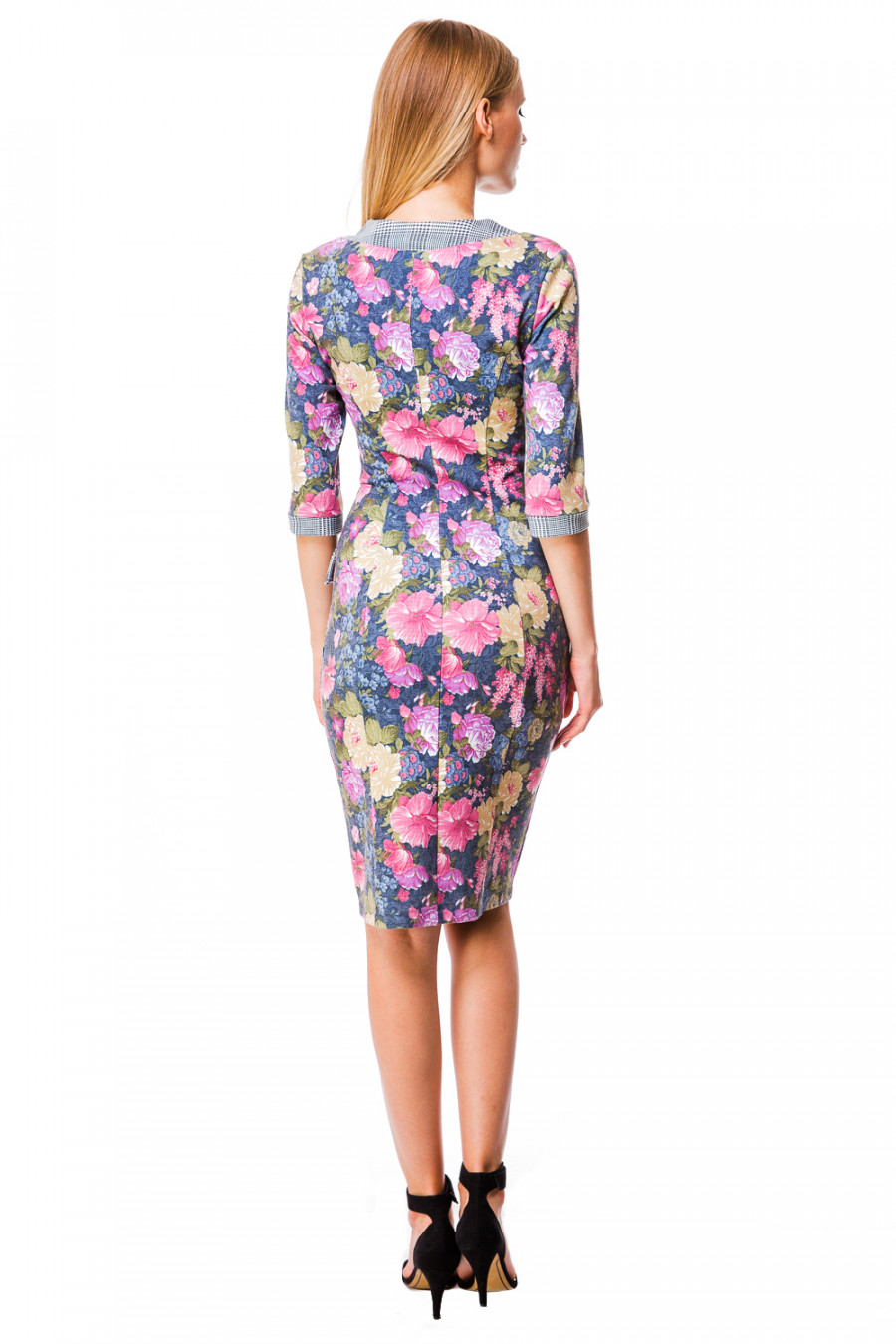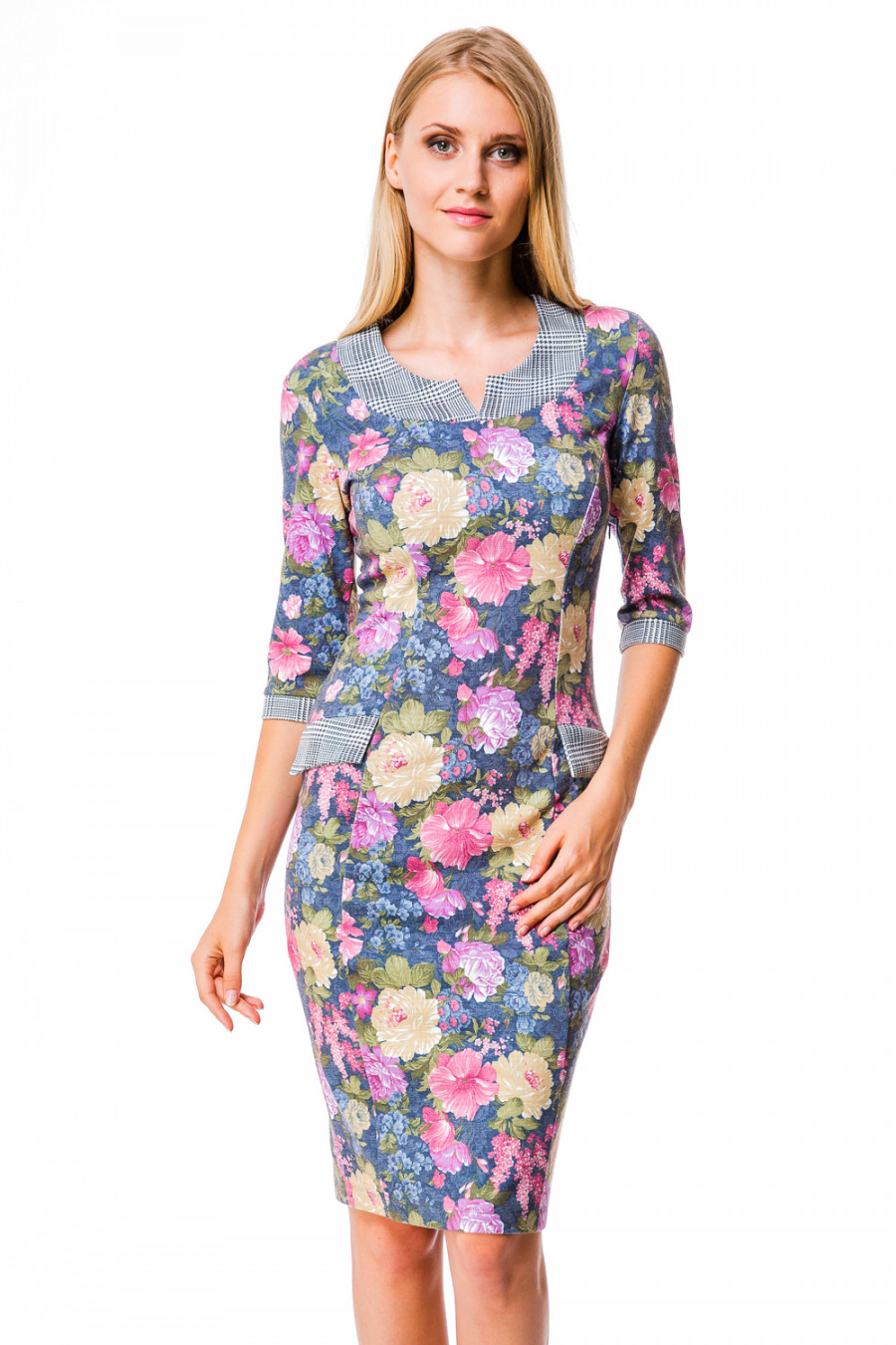 Элегантное платье облегающего силуэта. Модель с фигурным вырезом горловины и рукавами 3/4. В боковом шве потайная молния. Длина изделия выше колена. Платье украшено нежным принтом. Ворот и манжеты декорированы контрастным принтом. На передней части имеются накладные клапаны в виде карманов. Выполнено из высококачественной ткани, которая прекрасно держит форму. Идеальный вариант для создания женственного образа.