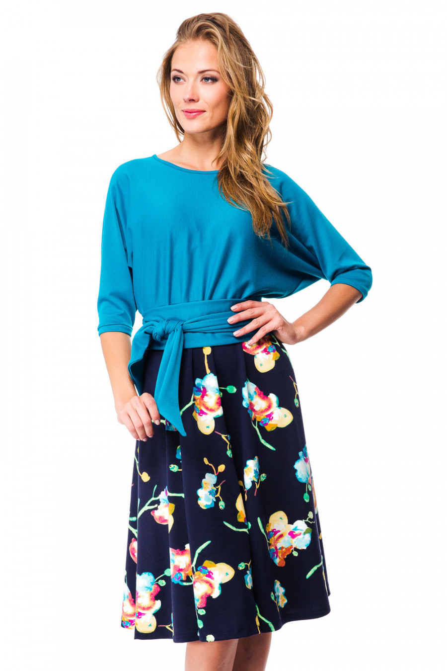 Прекрасное платье с рукавами 3/4 и округлым вырезом горловины. Модель выполнена в сочетании двух цветов. Верхняя часть-однотонного цвета свободного кроя. Нижняя часть- в виде юбки, декорированной оригинальным принтом в контрастном цвете. На талии модель дополнена поясом. Платье изготовлено из плотной ткани трикотажной группы. Приталенный силуэт подчеркивает достоинства фигуры.