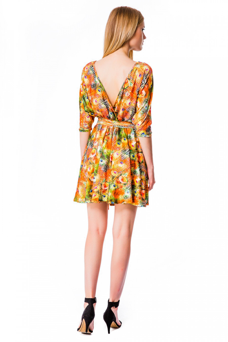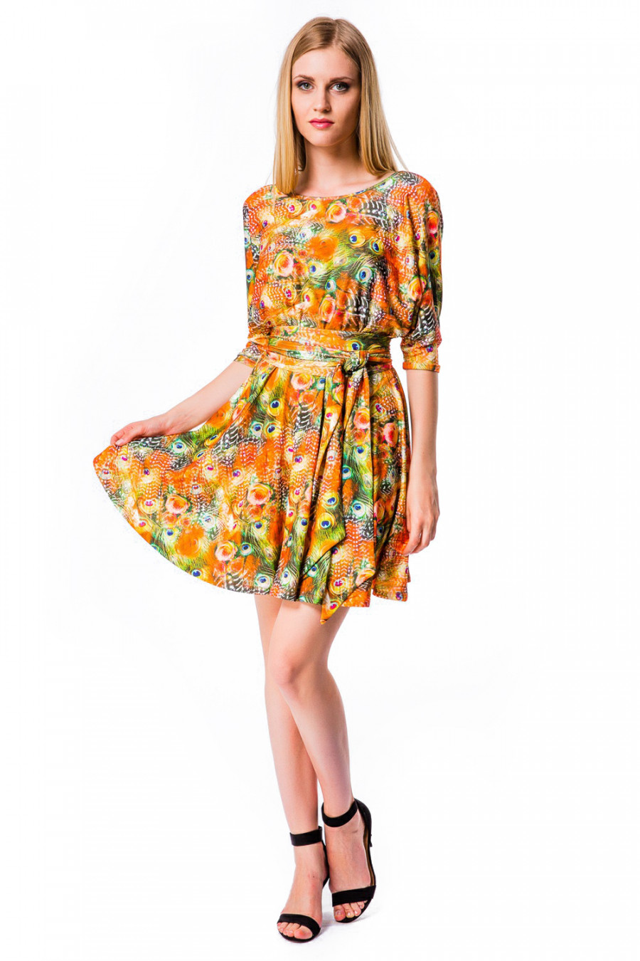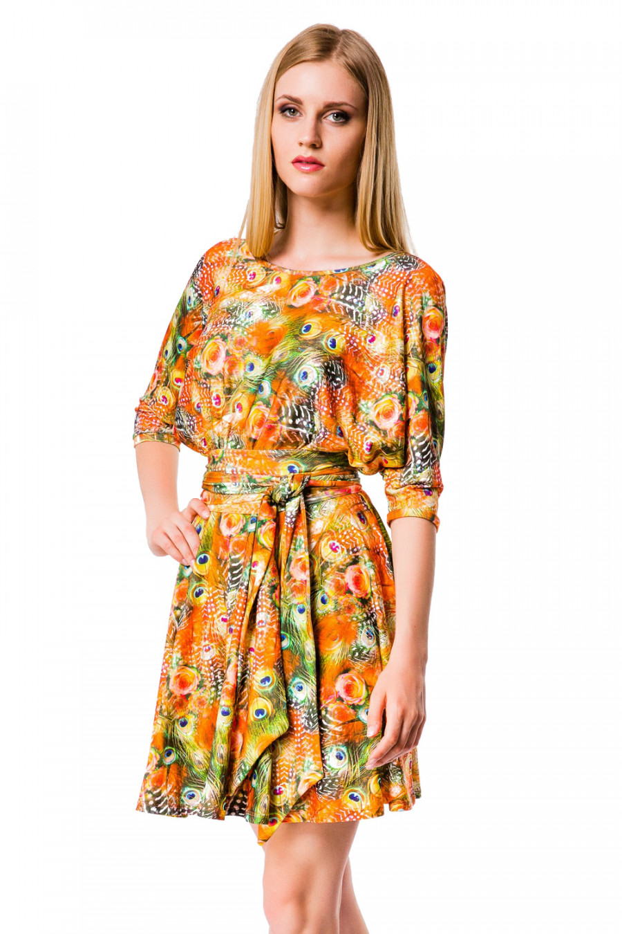 Стильное и женственное платье-мини с нежным принтом. Модель с вырезом горловины "лодочка" и рукавами 3/4 в виде "летучей мыши". Платье выполнено из приятной струящейся ткани высококачественного полотна микрофибры. На спине глубокий треугольный вырез. На талии модель украшена изящным пояском и резинкой. Свободный верх и расклешенная юбка с поясом на талии подчеркивают стройность фигуры.