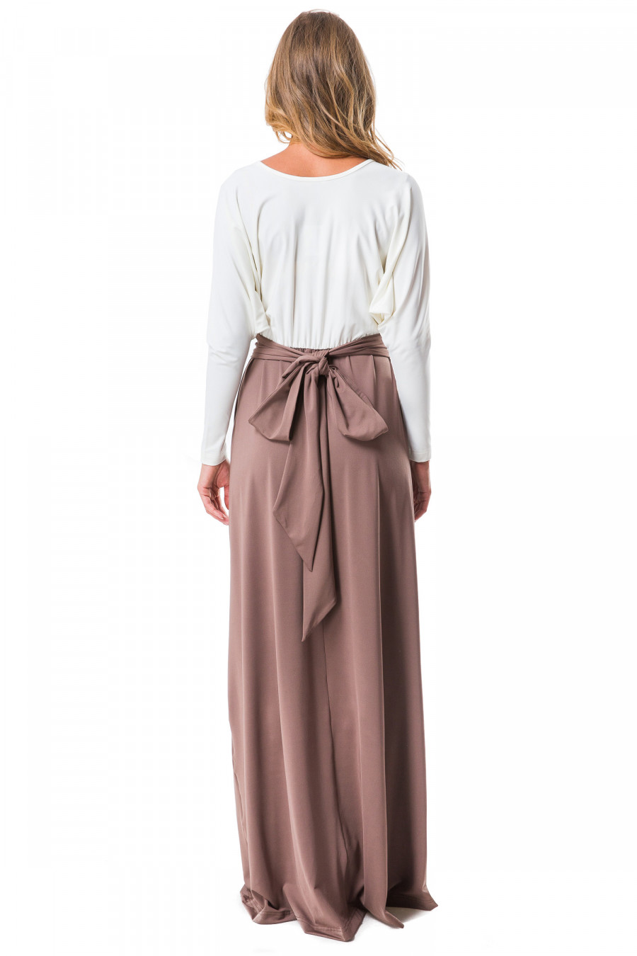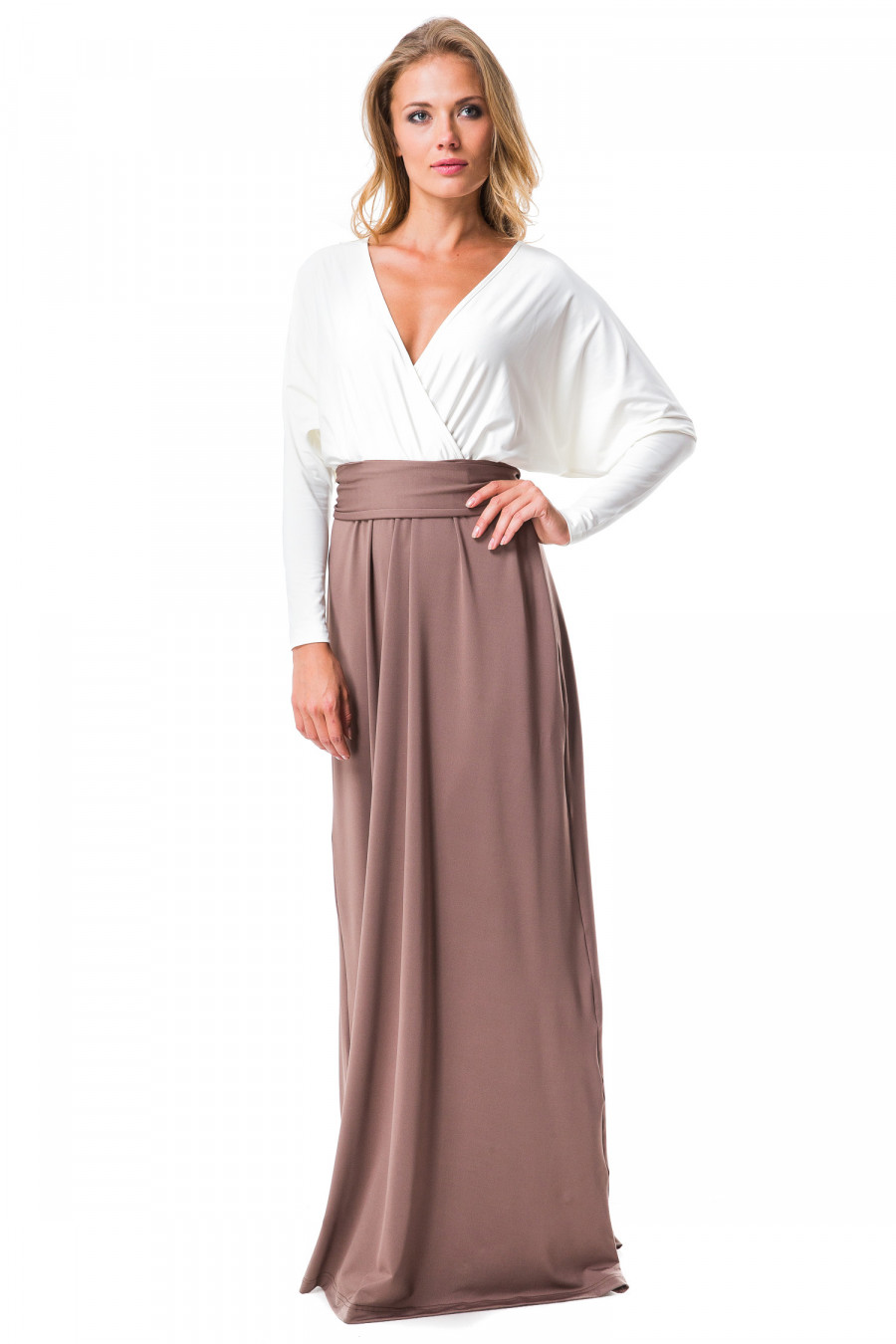 Женственное длинное платье. Модель свободного покроя с глубоким вырезом декольте. Модель выполнена из высококачественного материала микрофибры, очень приятная на ощупь, с небольшим лоском и выигрышно смотрится в данной модели. Верхняя часть платья выполнена в виде ""летучей мыши"" со свободными длинными рукавами. Нижнюю часть платья разделяет тонкая резинка на талии с изящным поясом. Модель выполнена в комбинации двух цветов.