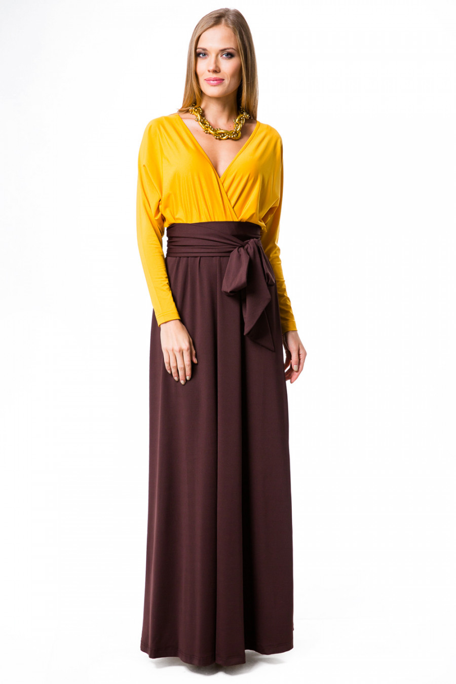 Женственное длинное платье. Модель свободного покроя с глубоким вырезом декольте. Модель выполнена из высококачественного материала микрофибры, очень приятная на ощупь, с небольшим лоском и выигрышно смотрится в данной модели. Верхняя часть платья выполнена в виде ""летучей мыши"" со свободными длинными рукавами. Нижнюю часть платья разделяет тонкая резинка на талии с изящным поясом. Модель выполнена в комбинации двух цветов.