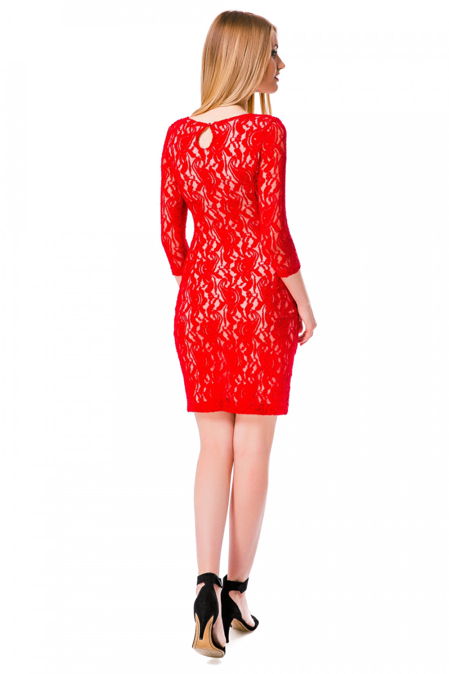 Оригинальная и изысканная модель платья. Модель приталенного кроя длиной выше колена, с округлым вырезом горловины и рукавами 3/4. Сзади застежка на пуговицу. Очаровательная модель выполнена из высококачественного ажурного полотна, нижняя часть - подкладка из гладкого однотонного материала. Эффектное платье подчеркнет Ваш изысканный вкус и стиль.