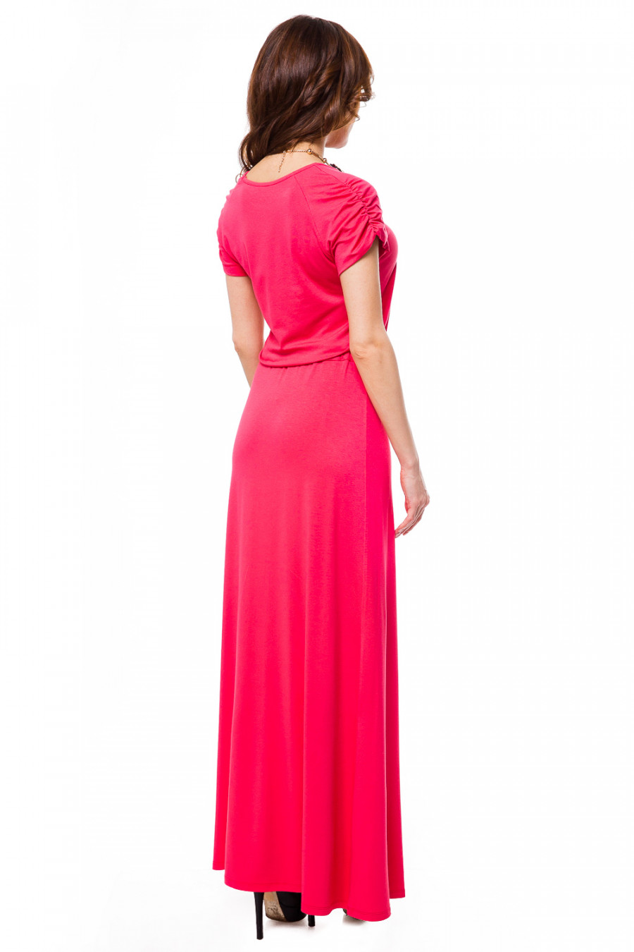 Стильное платье-макси. Модель свободного полуспортивного кроя. Верхняя часть-в виде футболки с отрезной талией, короткими рукавами и округлым вырезом горловины. Рукава драпированы складками. Нижняя часть юбки прямого кроя. На талии модель разделена тонкой резинкой. Платье выполнено из высококачественной вискозы и эластана.