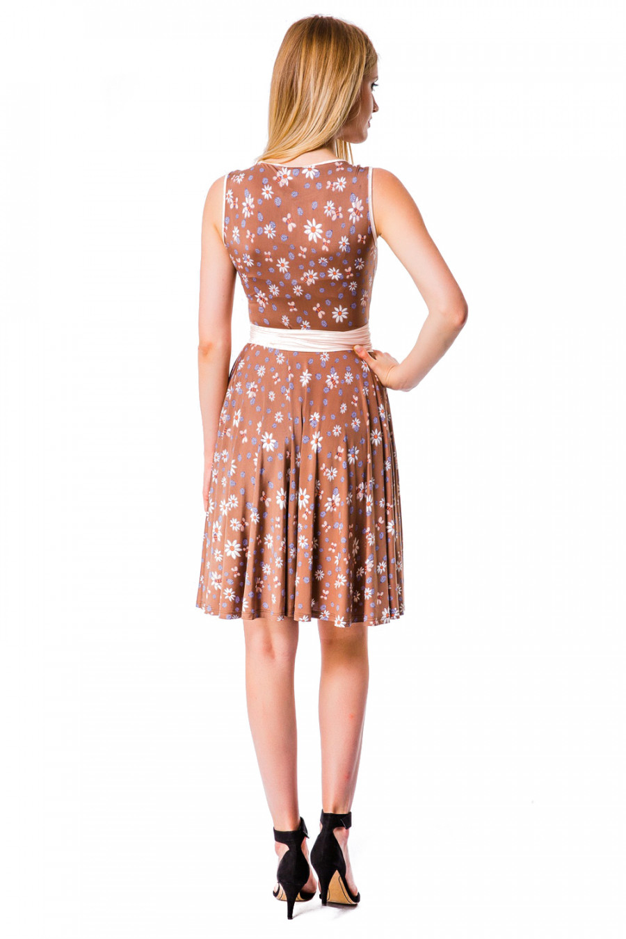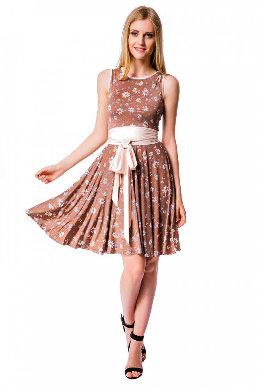 Невероятно нежное платье. Модель приталенного покроя без рукавов с широкой расклешенной юбкой, оформлена нежным цветочным принтом и длиной чуть выше колен. По краю горловины модель декорирована контрастным кантом. Оригинальной деталью служит контрастный пояс. Эта модель станет замечательной базовой вещью для Вашего гардероба.