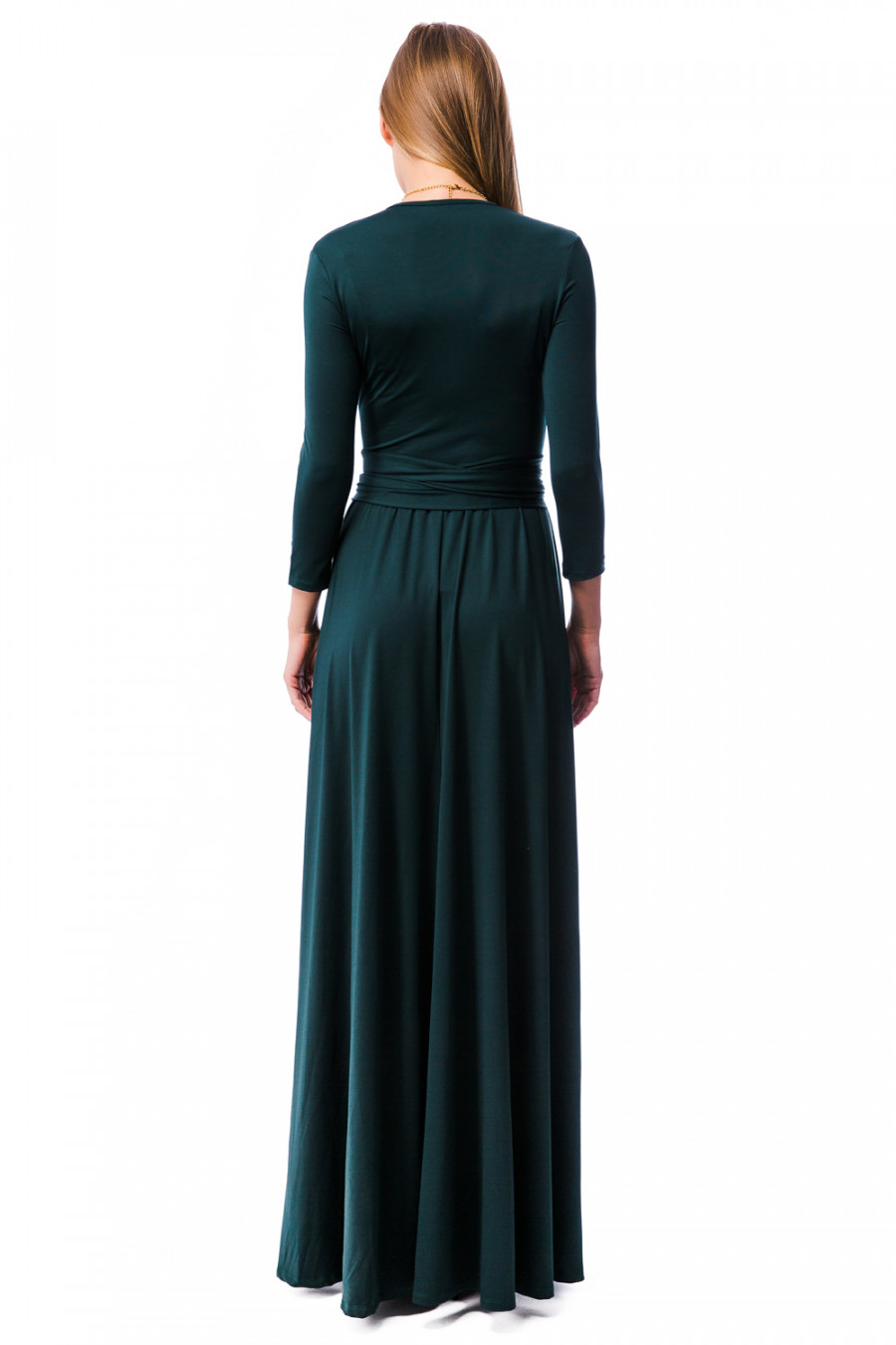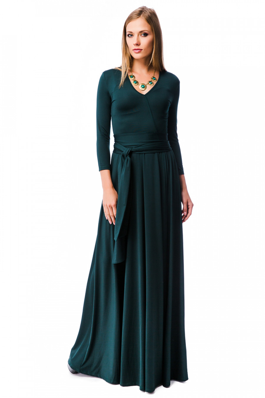 Элегантное платье в пол. Модель облегающего покроя с широкой свободной юбкой и глубоким вырезом декольте. Платье выполнено из приятной струящейся ткани высококачественного полотна микрофибры. Верхняя часть платья облегающего кроя с укороченными рукавами. По линии декольте- обработка двойным кантом. Нижняя часть юбки украшена разрезом с левой стороны. Модель дополнена широким поясом. Прекрасный вариант для создания женственного образа.