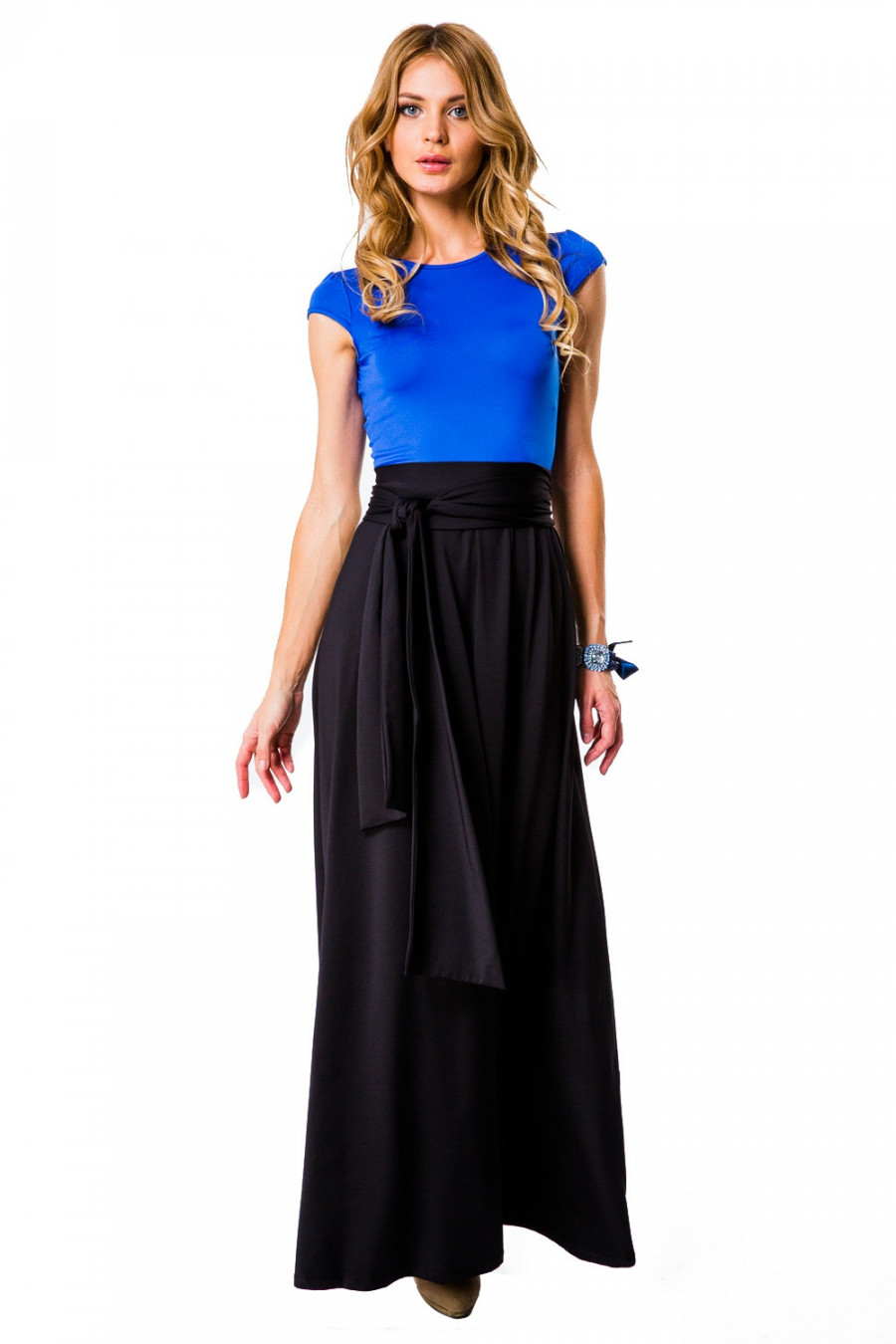 Эффектное платье в пол в коротким рукавом. Модель с округлым вырезом горловины и глубоким вырезом в виде треугольника на спине. Длинное платье выполнено из приятной струящейся ткани высококачественного полотна микрофибры. На талии модель украшена изящным пояском. Платье выполнено в сочетании двух цветов. Изысканный наряд создаст обворожительный неповторимый образ. Приталенный силуэт подчеркивает стройность фигуры.