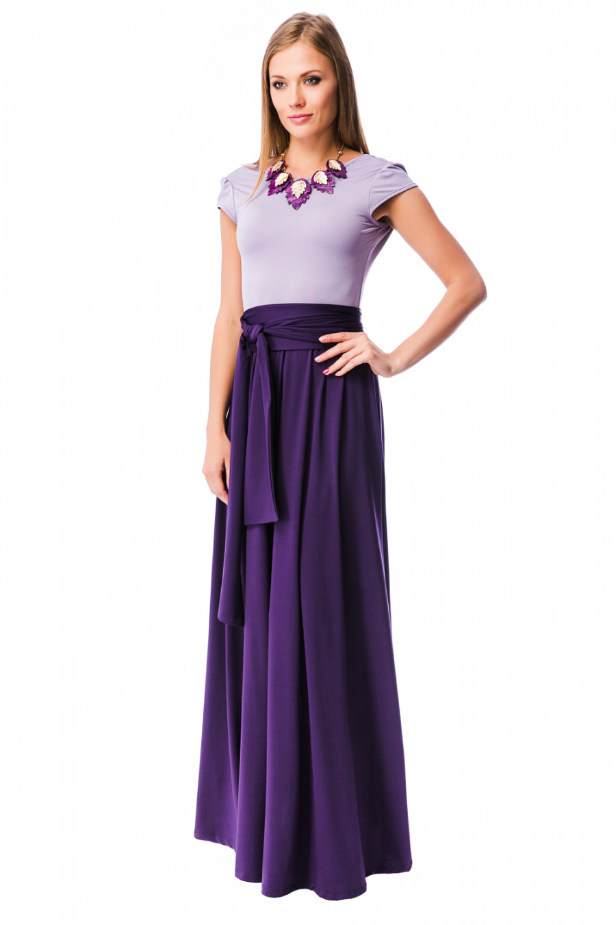 Эффектное платье в пол в коротким рукавом. Модель с округлым вырезом горловины и глубоким вырезом в виде треугольника на спине. Длинное платье выполнено из приятной струящейся ткани высококачественного полотна микрофибры. На талии модель украшена изящным пояском. Платье выполнено в сочетании двух цветов. Изысканный наряд создаст обворожительный неповторимый образ. Приталенный силуэт подчеркивает стройность фигуры.