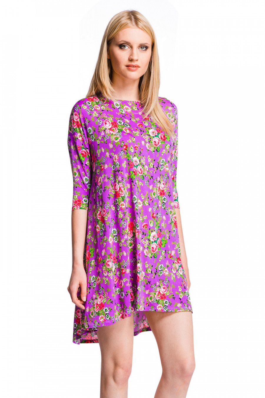 Изящное платье свободного кроя. Модель с округлым вырезом горловины и рукавами 3/4. Трапециевидный свободный крой делает модель лёгкой и воздушной. Передняя часть модели укорочена. Платье выполнено из качественного материала-микрофибры. Модель выполнена в розовом цвете с ярким принтом в цветок.