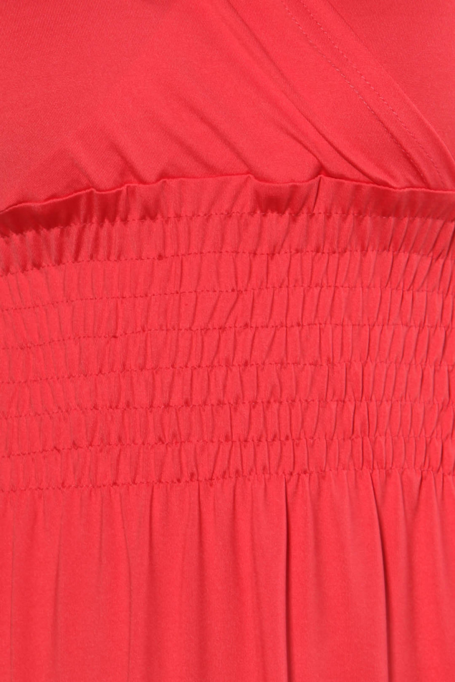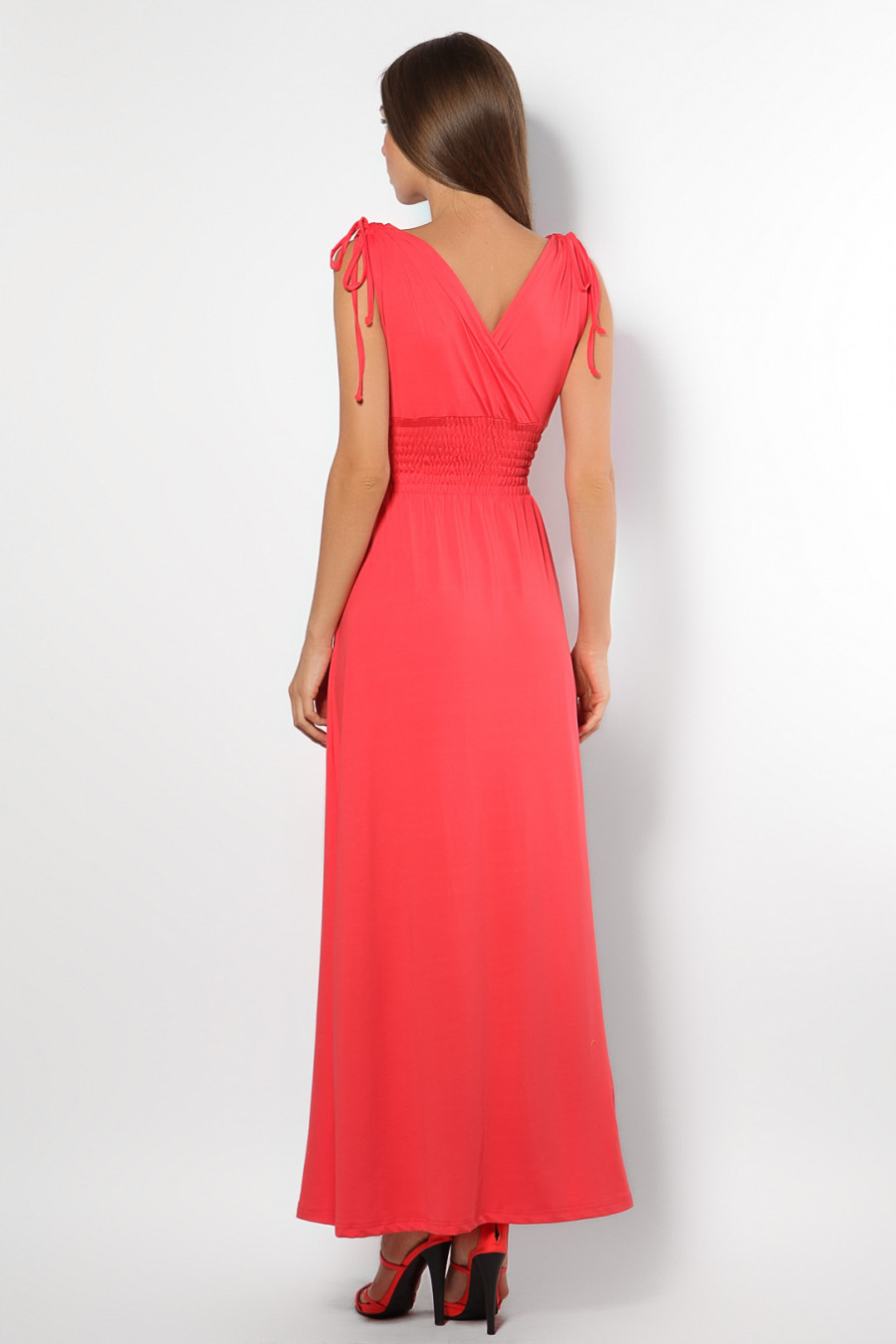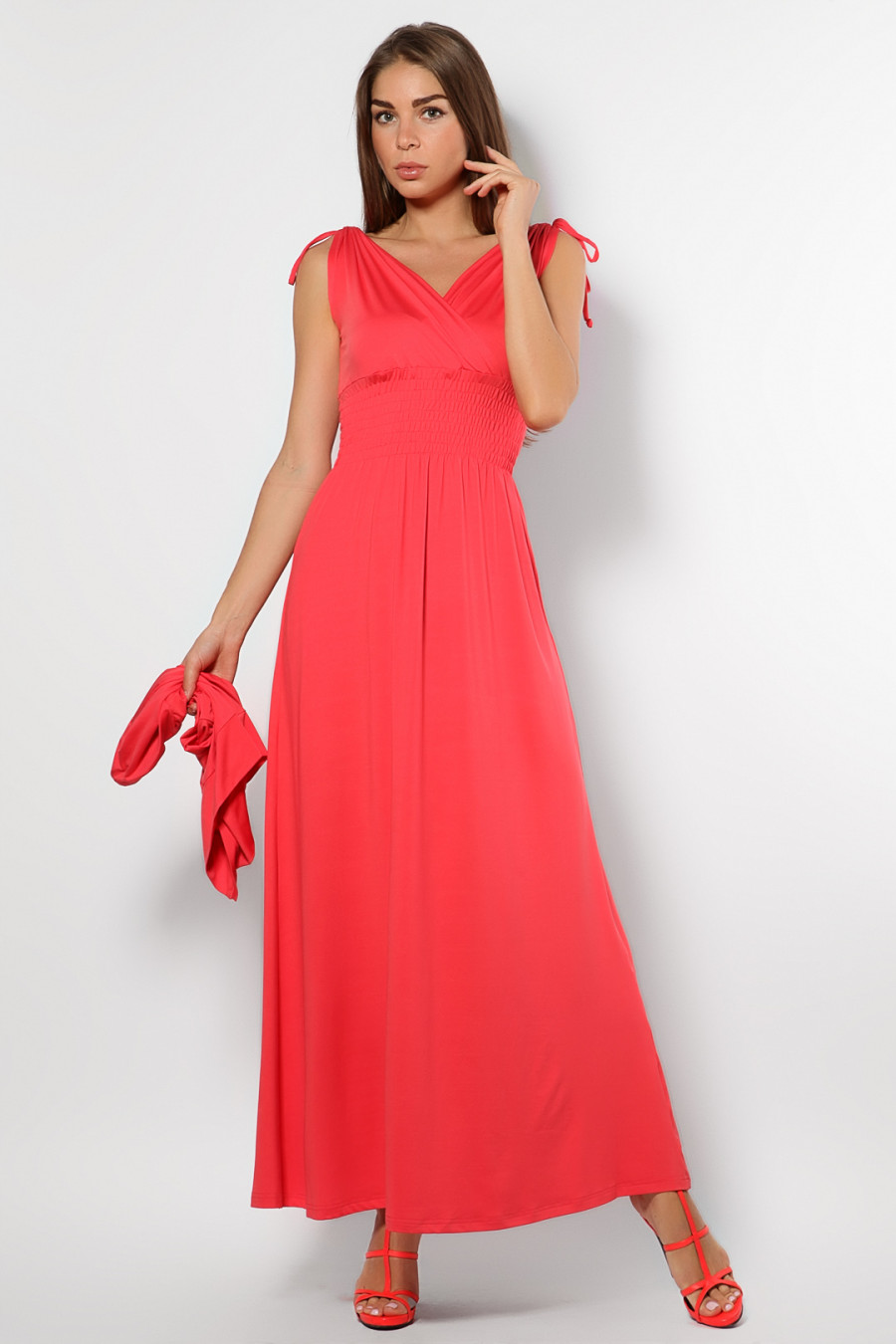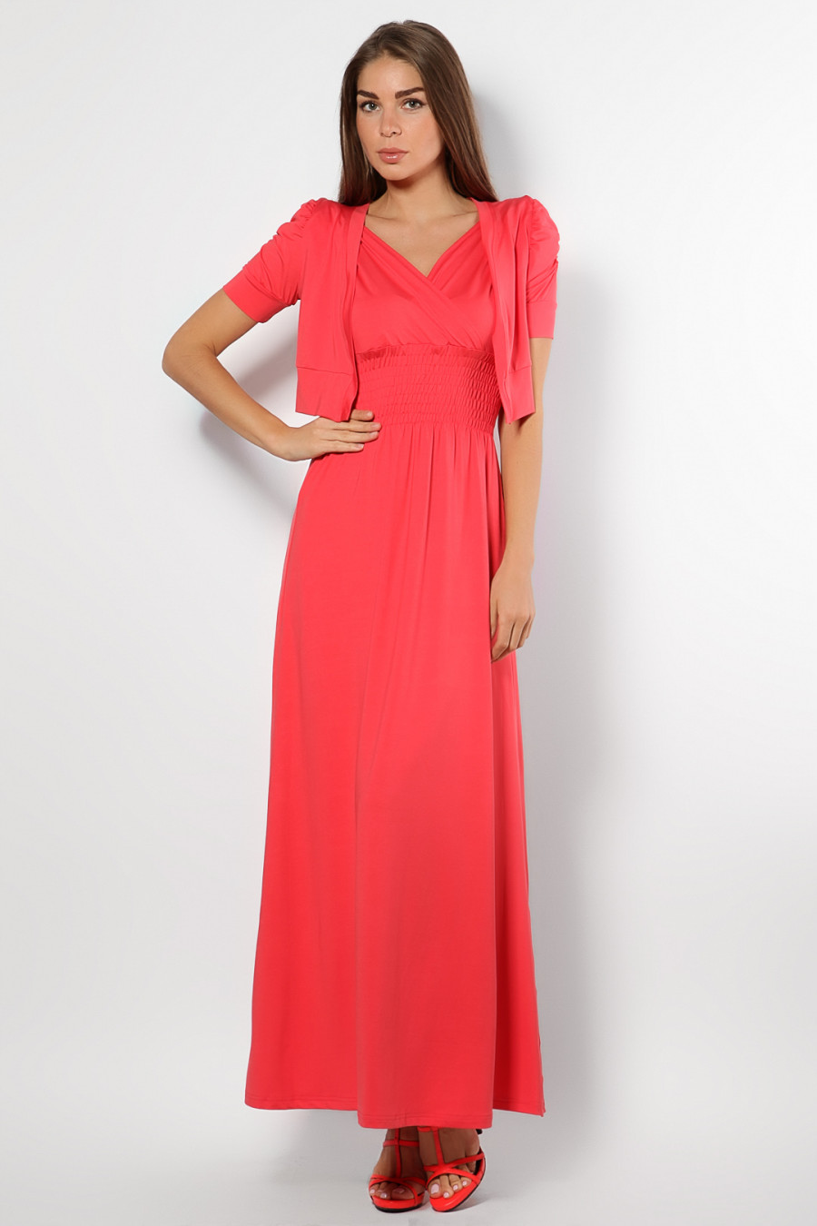 Длинное платье с V-образным вырезом из микрополиэстера. На талии широкая резинка, подчеркивающая вашу фигуру. В комплекте также идет короткая кофточка с рукавом 3/4.