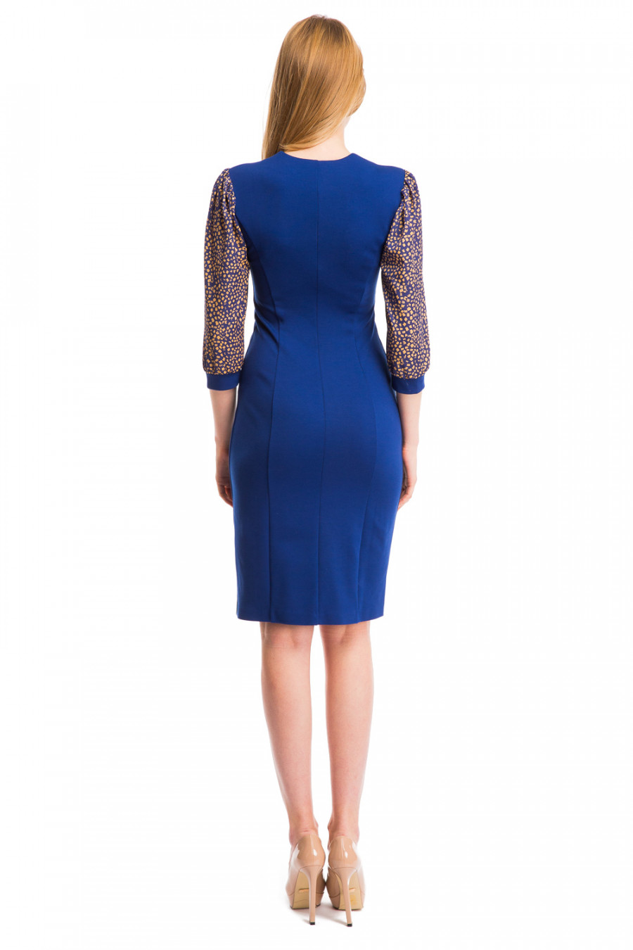 Оригинальное платье приталенного силуэта. Модель с изящным вырезом горловины ""каре"" выполнена из качественного материала. Главным акцентом в модели являются рукава из лёгкого воздушного материала контрастного цвета. Манжет окантован однотонной тканью. Стильная и нарядная модель на любой случай.