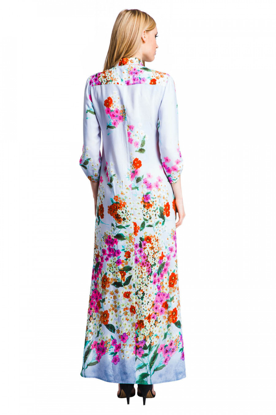 Стильное длинное платье. Модель свободного прямого кроя с разрезами по бокам. Платье с воротом на стойке и  укороченными рукавами с застёжкой  ""пата"" для фиксации подвёрнутого  рукава. По центральной части модель дополнена на пуговицы. Выполнена из легкого материала и украшено принтом.