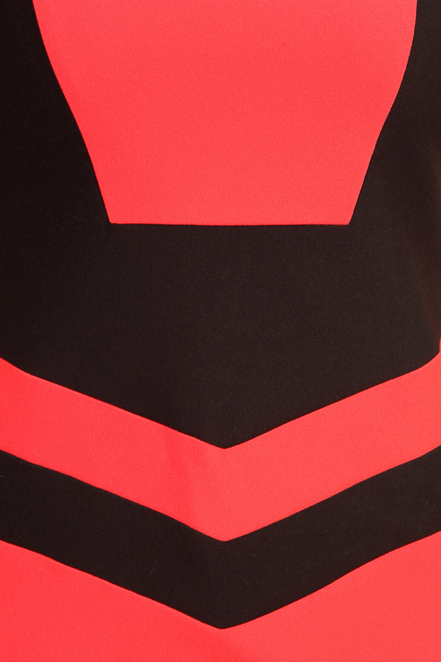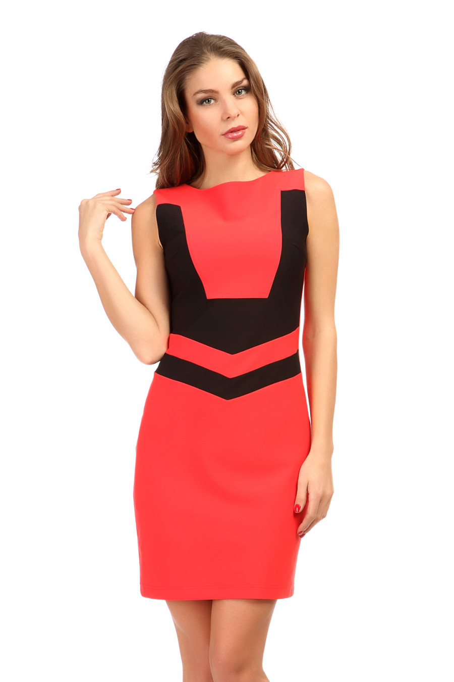 Женственное платье полуприталенного силуэта с круглым вырезом горловины без рукавов.Изделия выполнено из ткани костюмной группы с добавлением эластана.По переду платье украшено контрастными геометрическими вставками.По спинке застежка на потайную молнию .Длина платья 83см.Для завершения образа подберите клатч в тон вставки и без особых усилий окажетесь в центре внимания на любой вечеринке.