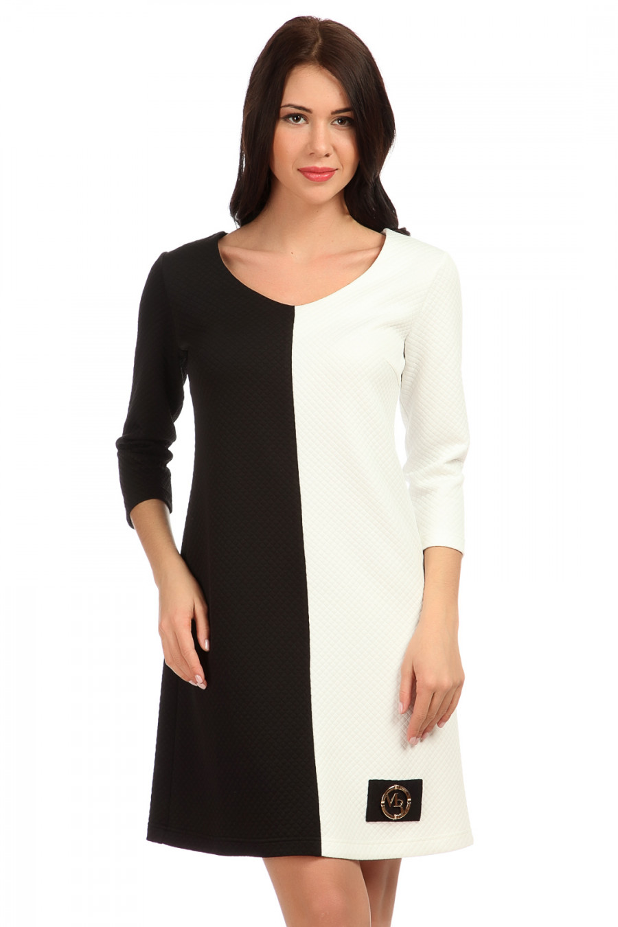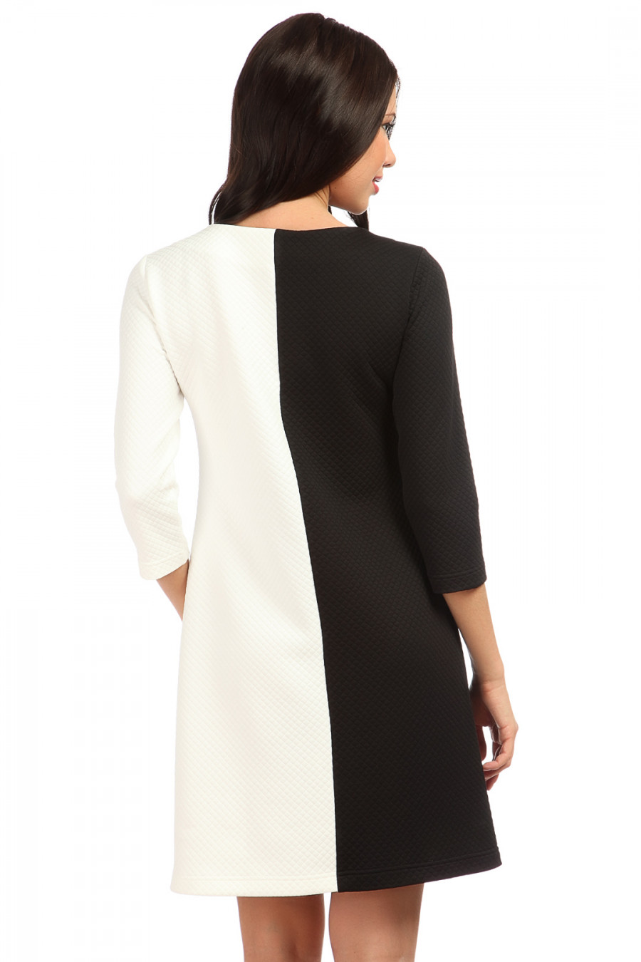 Платье свободного покроя со швом посередине, разделяющим изделие на две части-левую светлую, и правую - темную. Рукав 3/4.