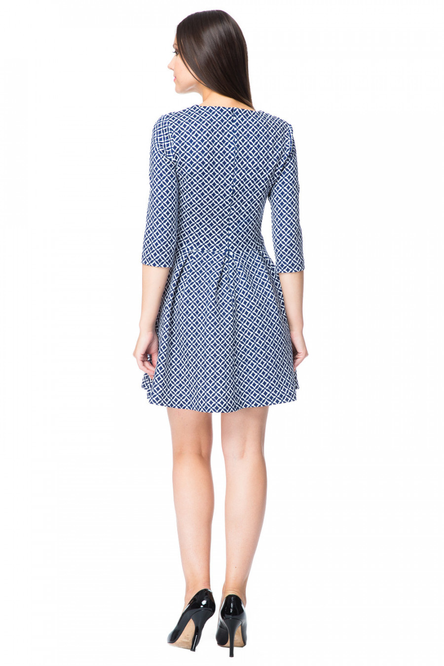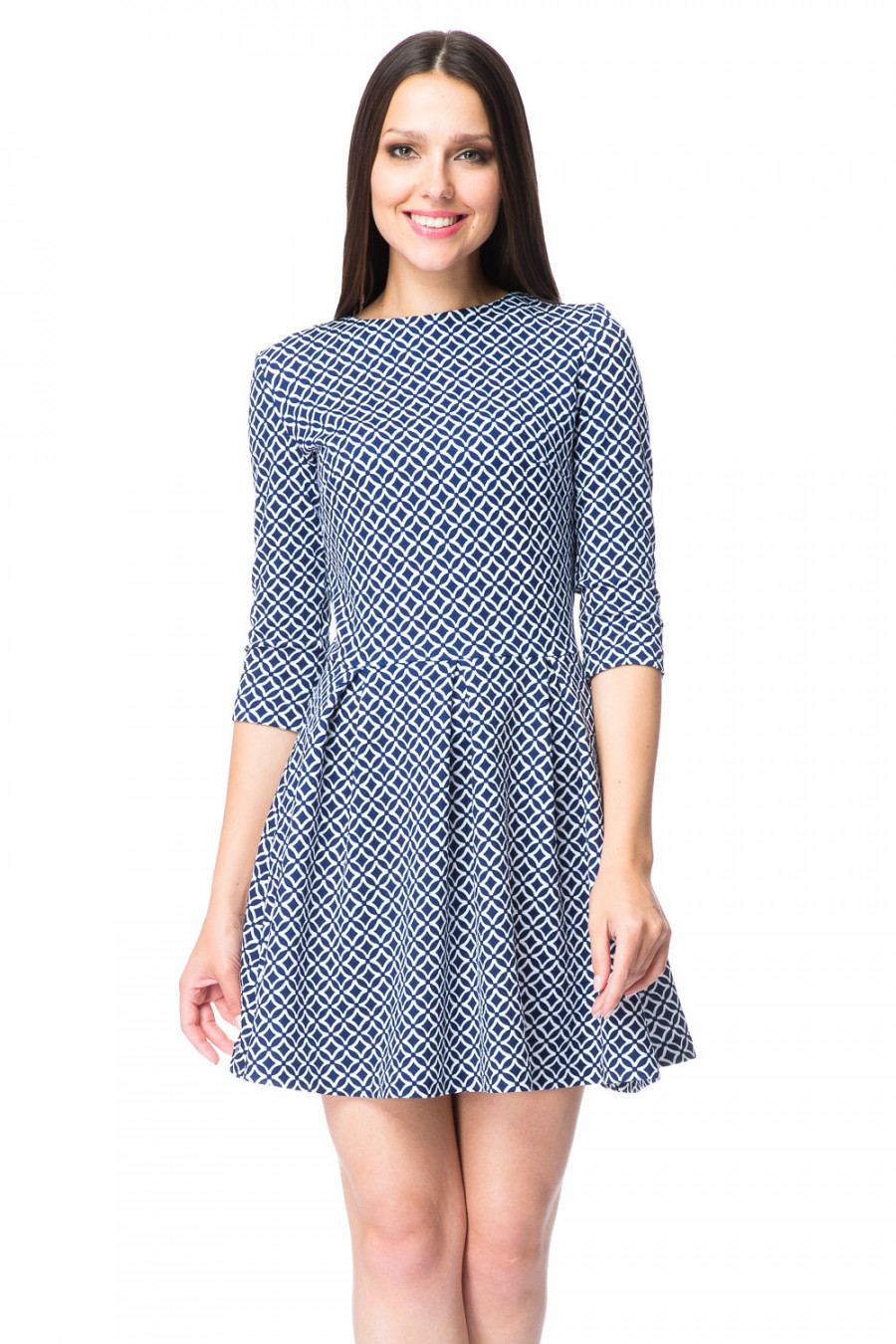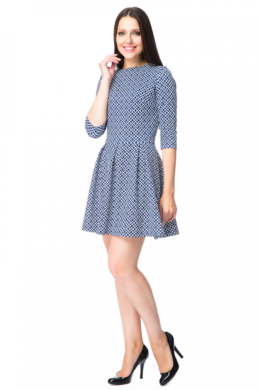 Стильное платье в строгом классическом стиле органично впишется в повседневный гардероб. Модель с вырезом горловины ""лодочка"" и рукавами 3/4. Юбка модели отрезная от линии талии, расклешенная с объемными складками. Длина изделия выше колена. Модель станет замечательным дополнением к Вашему гардеробу.