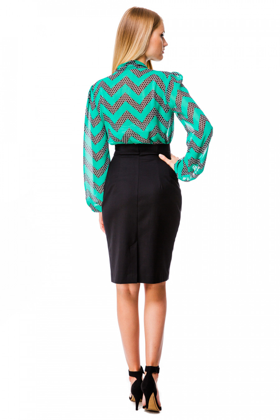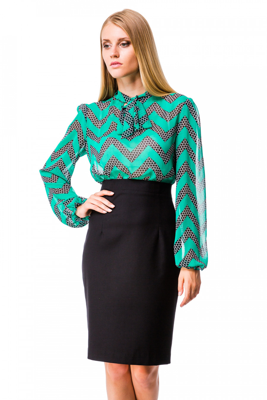 Элегантное платье облегающего силуэта. Модель с длинным свободным рукавом. Верхняя часть выполнена из лёгкого полупрозрачного креп-шифона, нижняя часть- из текстильной ткани, которая прекрасно держит форму. По линии ворота модель украшена небольшими завязками. Стильная модель визуально создаёт эффект ""два в одном""- блузки и юбки. Модель дополнена скрытой молнией сбоку и небольшим разрезом сзади. Идеальный вариант для создания женственного образа.