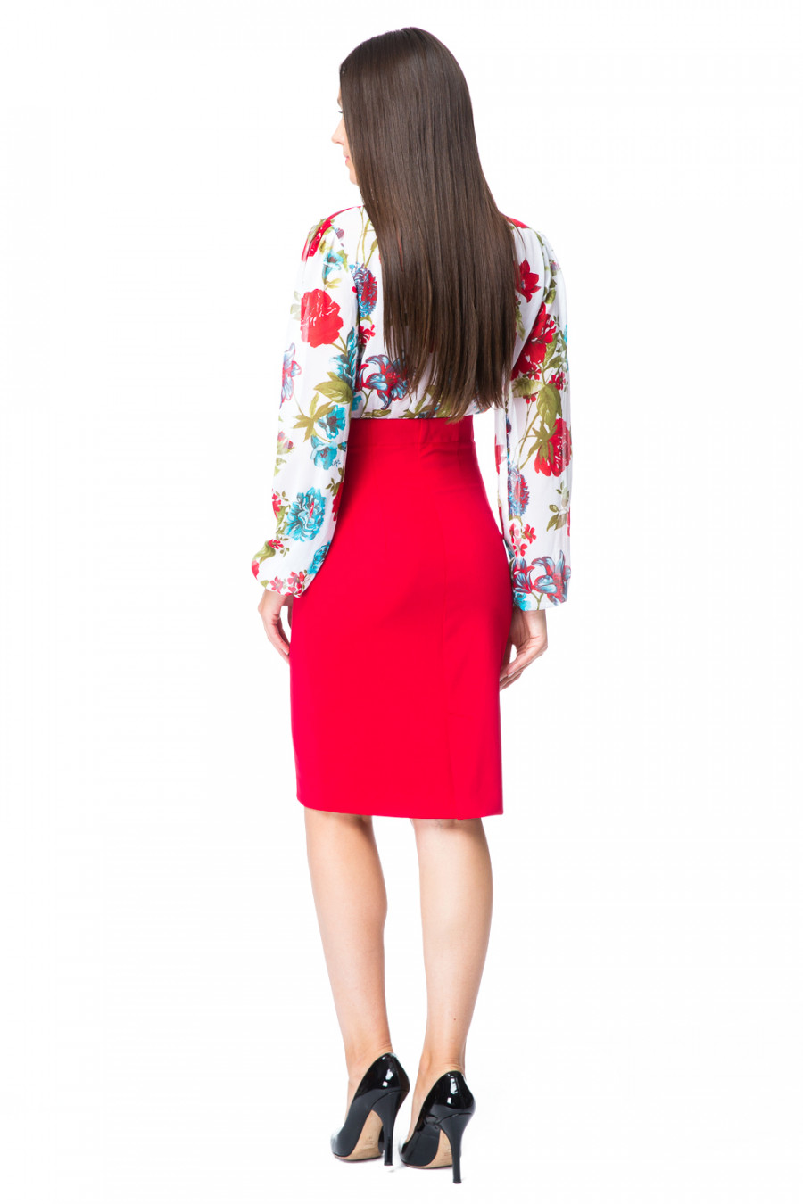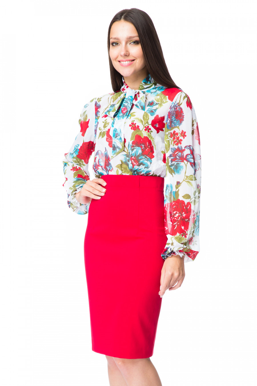 Элегантное яркое платье облегающего силуэта. Модель с длинным свободным рукавом. Верхняя часть выполнена из лёгкого полупрозрачного креп-шифона светлого цвета с принтом, нижняя част