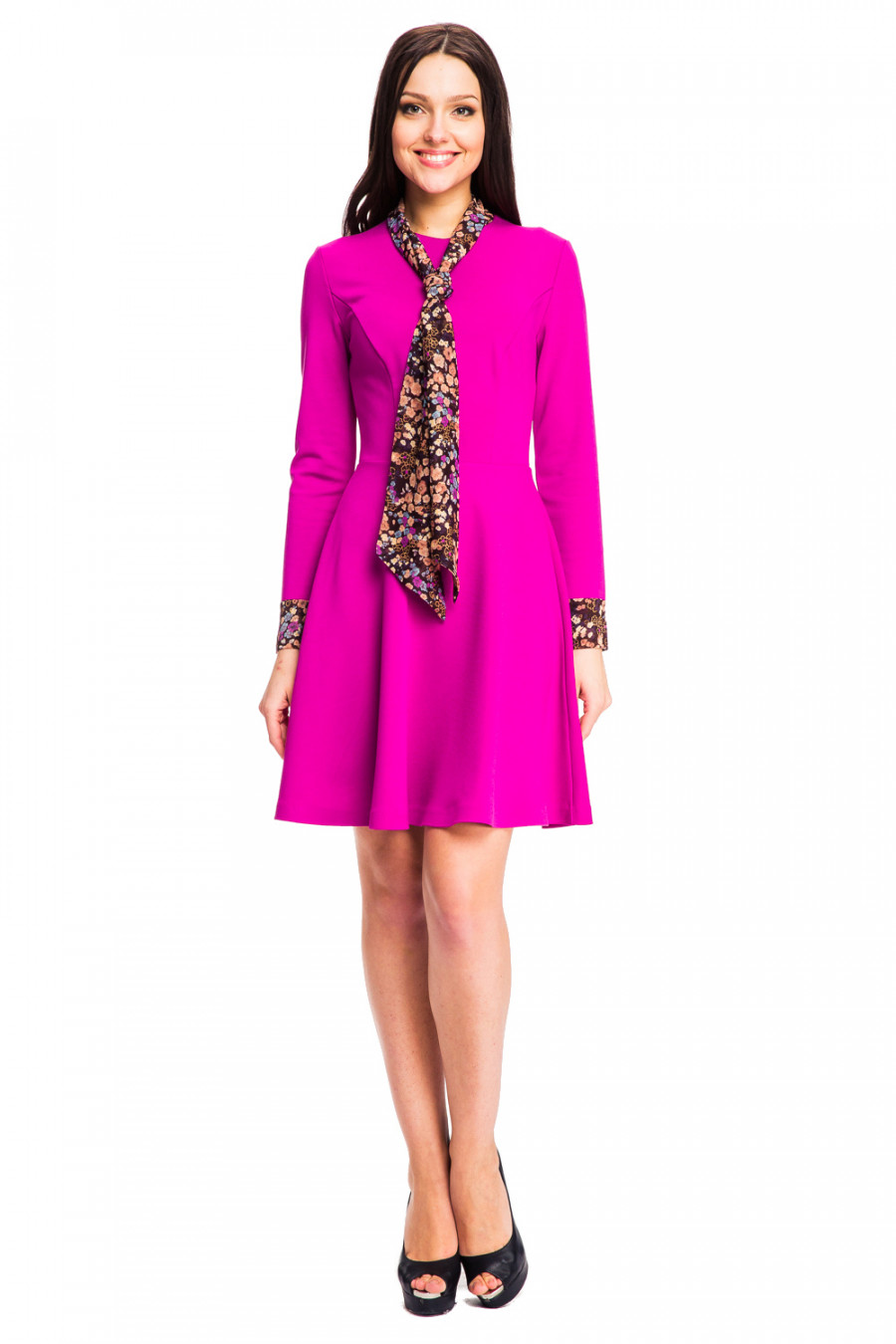 Эффектное платье прилегающего силуэта выполнено из высококачественного, эластичного и плотного трикотажного джерси. Модель отрезного типа лаконичного дизайна с длинным рукавом и округлым вырезом горловины. Главным украшением являются контрастные вставки из креп-шифона по линии манжет и красивый бант по линии ворота, который можно легко отрегулировать по нужной длине. Сзади-застёжка на молнию и пуговицы. Прекрасный вариант для модных женщин, желающих подчеркнуть свою индивидуальность и хороший вкус.