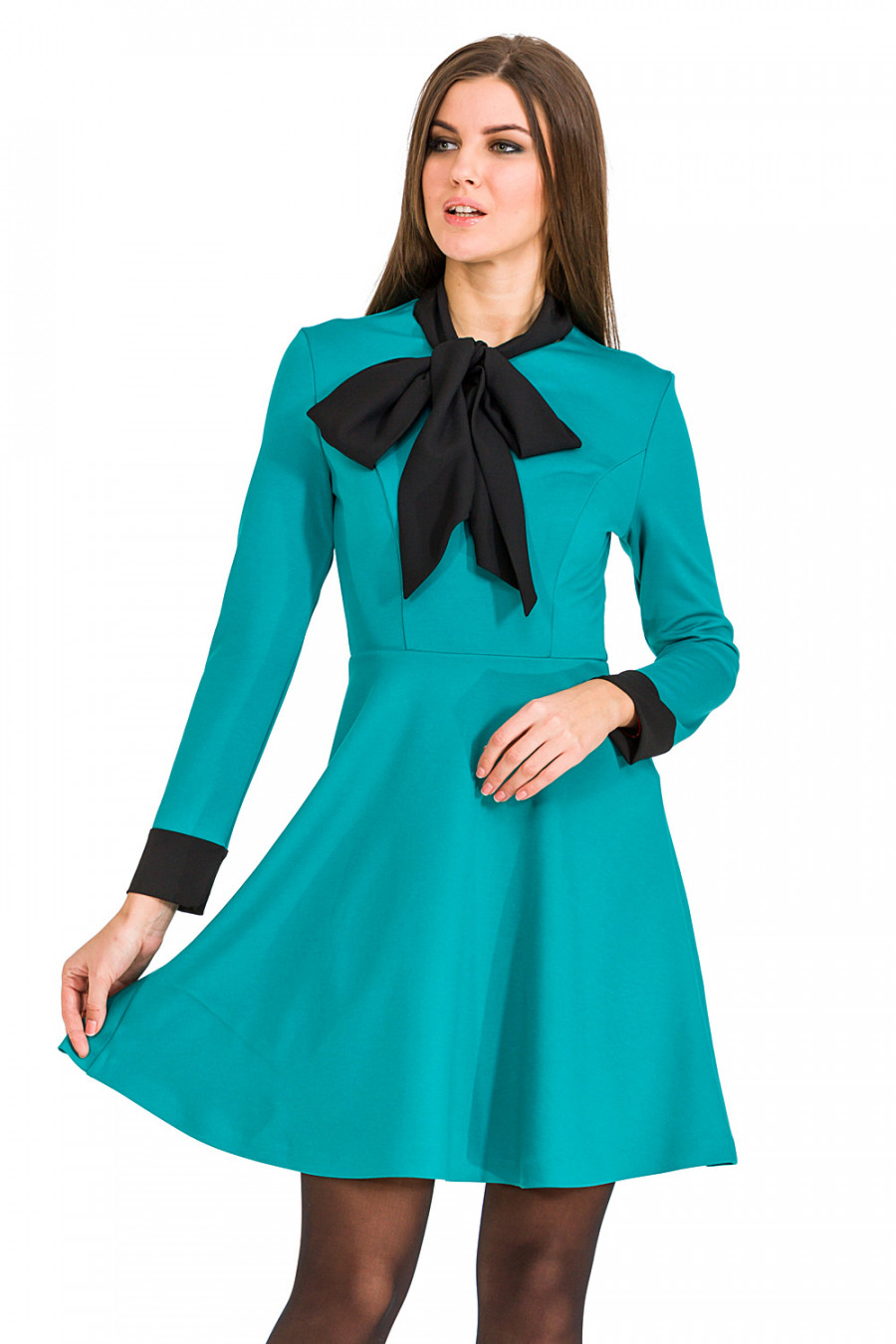 Эффектное платье прилегающего силуэта выполнено из высококачественного, эластичного и плотного трикотажного джерси. Модель отрезного типа лаконичного дизайна с длинным рукавом и округлым вырезом горловины. Главным украшением являются контрастные вставки из креп-шифона по линии манжет и красивый бант по линии ворота, который можно легко отрегулировать по нужной длине. Сзади-застёжка на молнию и пуговицы. Прекрасный вариант для модных женщин, желающих подчеркнуть свою индивидуальность и хороший вкус.