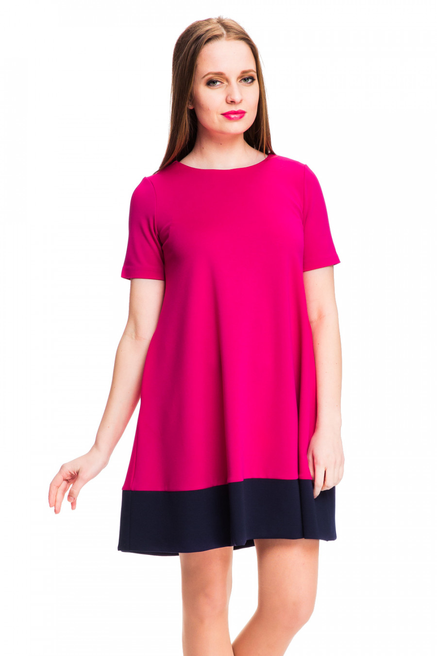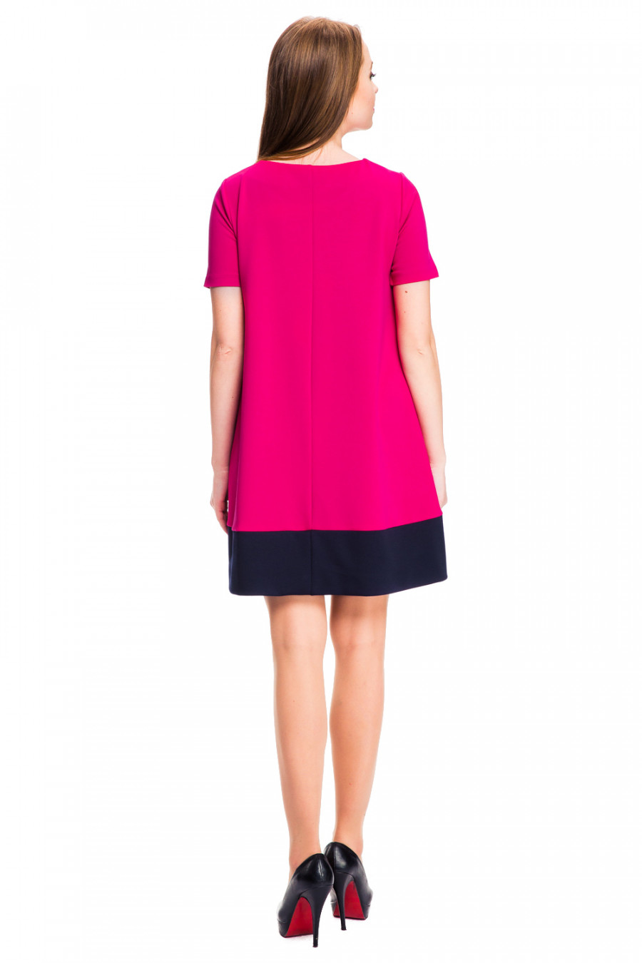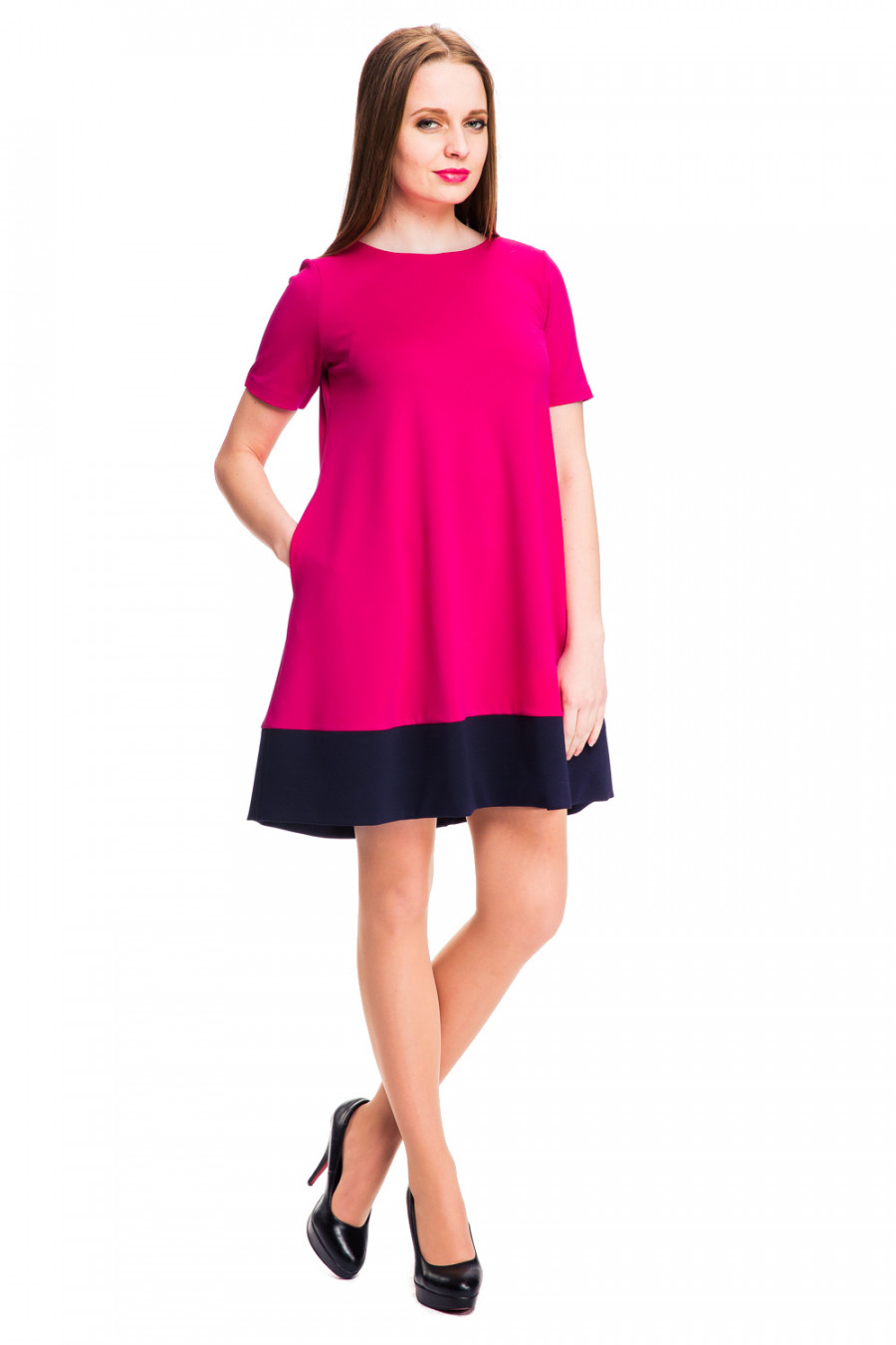 Стильное платье свободного кроя. Модель трапециевидного силуэта с округлым вырезом горловины и короткими рукавами. Дополнена боковыми карманами, выполнена из качественного плотного трикотажного материала. Длина изделия- выше колена. Сзади-застёжка на молнию. Нижняя часть декорирована чёрной вставкой. Великолепный выбор на любой случай.
