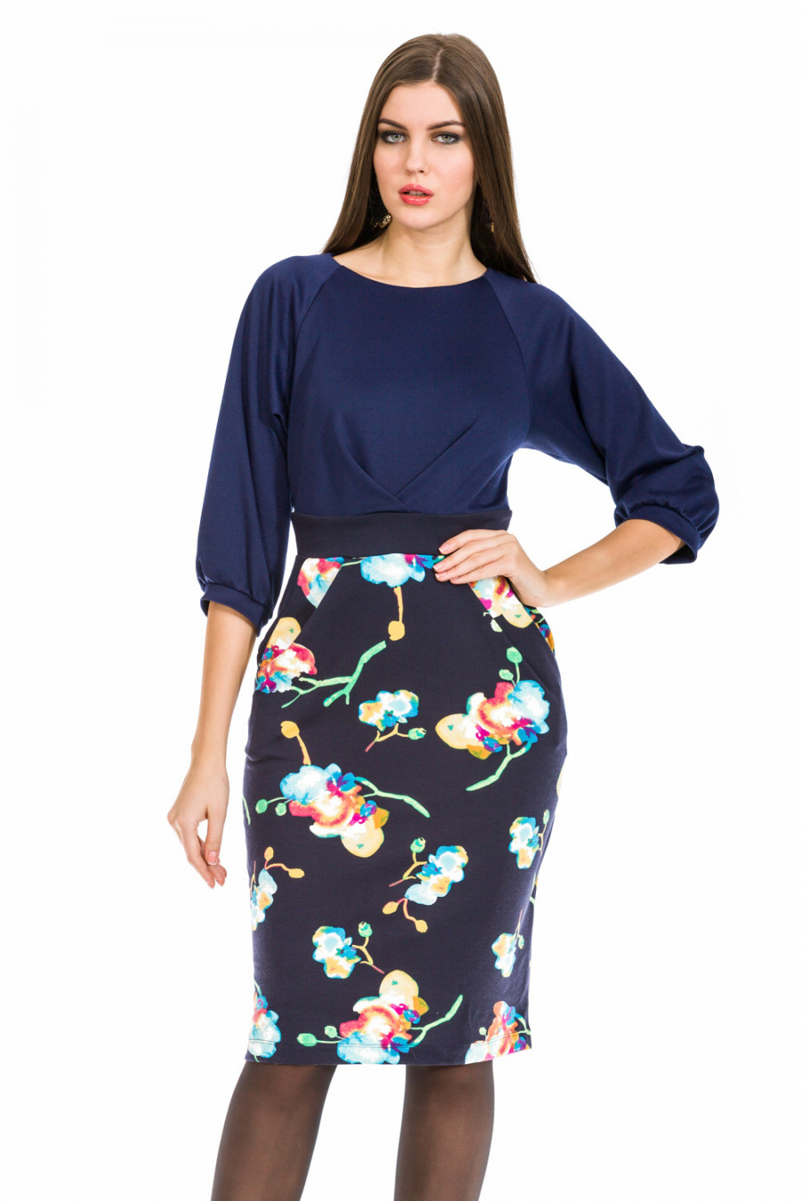 Стильное платье приталенного силуэта. Модель с округлым вырезом горловины и укороченными рукавами-реглан. Манжет обработан небольшой сборкой. Талия разделена широким поясом. Платье декорировано складками от линии талии и карманами. Нижняя часть украшена принтом. Сзади-застёжка на молнию. Модель выполнена из качественного материала насыщенной расцветки. Удобный и практичный вариант.