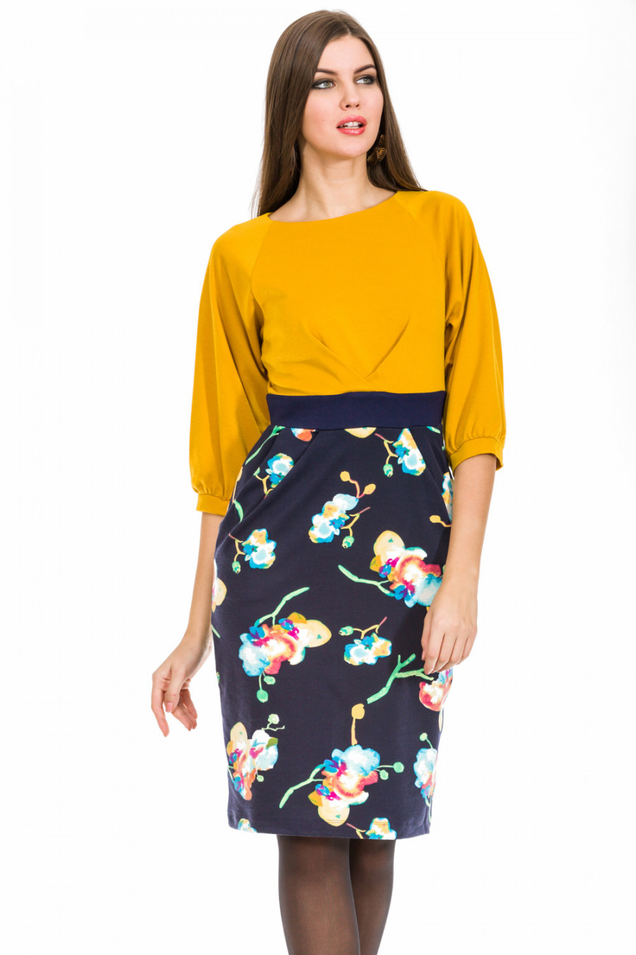 Стильное платье приталенного силуэта. Модель с округлым вырезом горловины и укороченными рукавами-реглан. Манжет обработан небольшой сборкой. Талия разделена широким поясом. Платье декорировано складками от линии талии и карманами. Нижняя часть украшена принтом. Сзади-застёжка на молнию. Модель выполнена из качественного материала насыщенной расцветки. Удобный и практичный вариант.