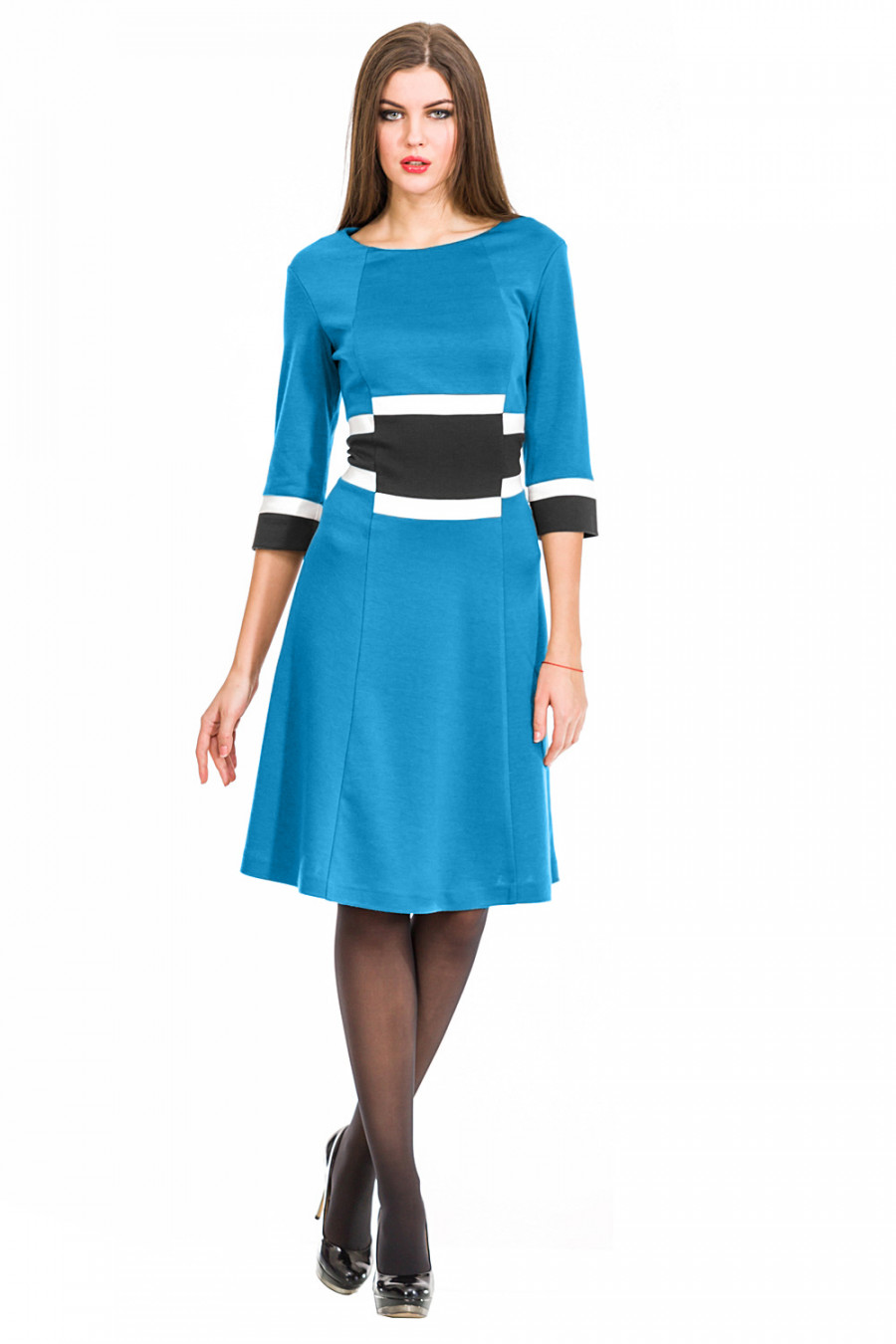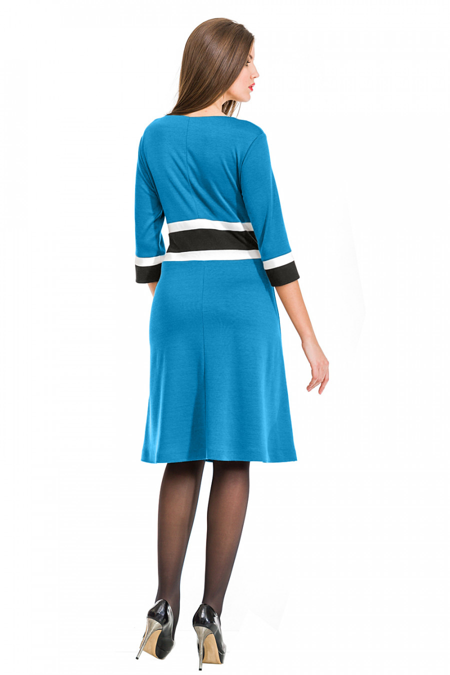 Элегантное платье с округлым вырезом горловины и рукавом 3/4. Спокойный сдержанный крой в сочетании с изящным решением на талии делает платье уникальным и необычным. Вставки на талии и манжетах в контрастных цветовых решениях. Нижняя часть-слегка расклешенная юбка. Длина изделия-миди. Прекрасный вариант как на каждый день, так и на праздник.