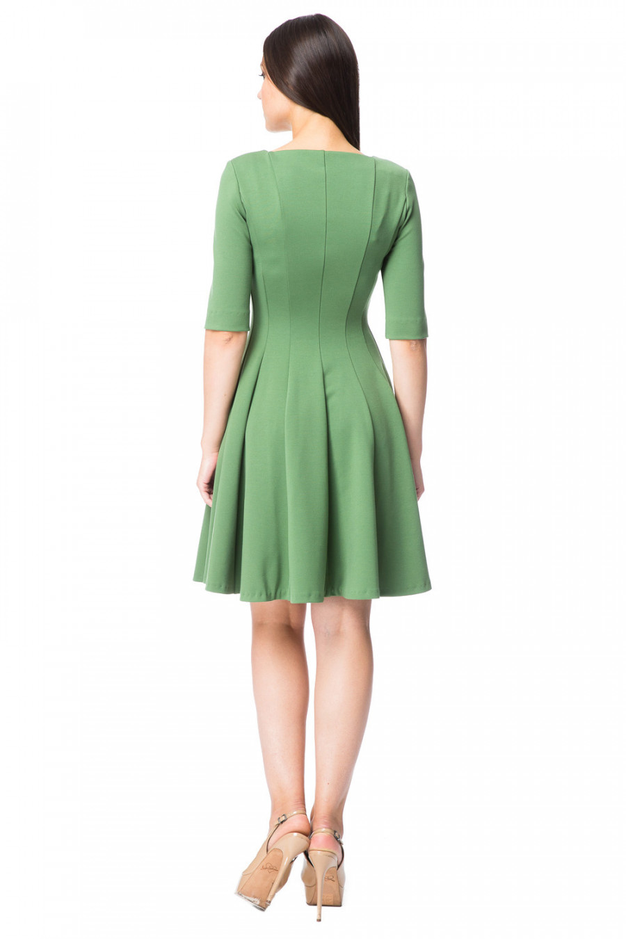 Оригинальное платье приталенного силуэта с расклешенной юбкой из клиньев. Модель с округлым вырезом горловины и рукавами 3/4. Платье выполнено из текстурного трикотажа однотонного цвета. Длина модели-ниже колена. Сзади-застёжка на потайную молнию. Прекрасный вариант для модных женщин, желающих подчеркнуть свою индивидуальность и хороший вкус.