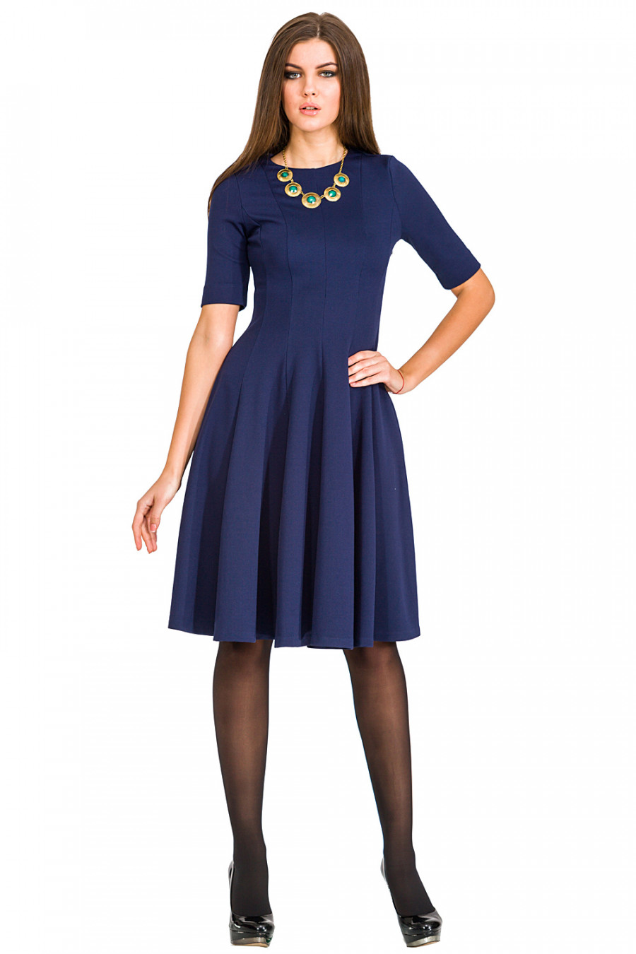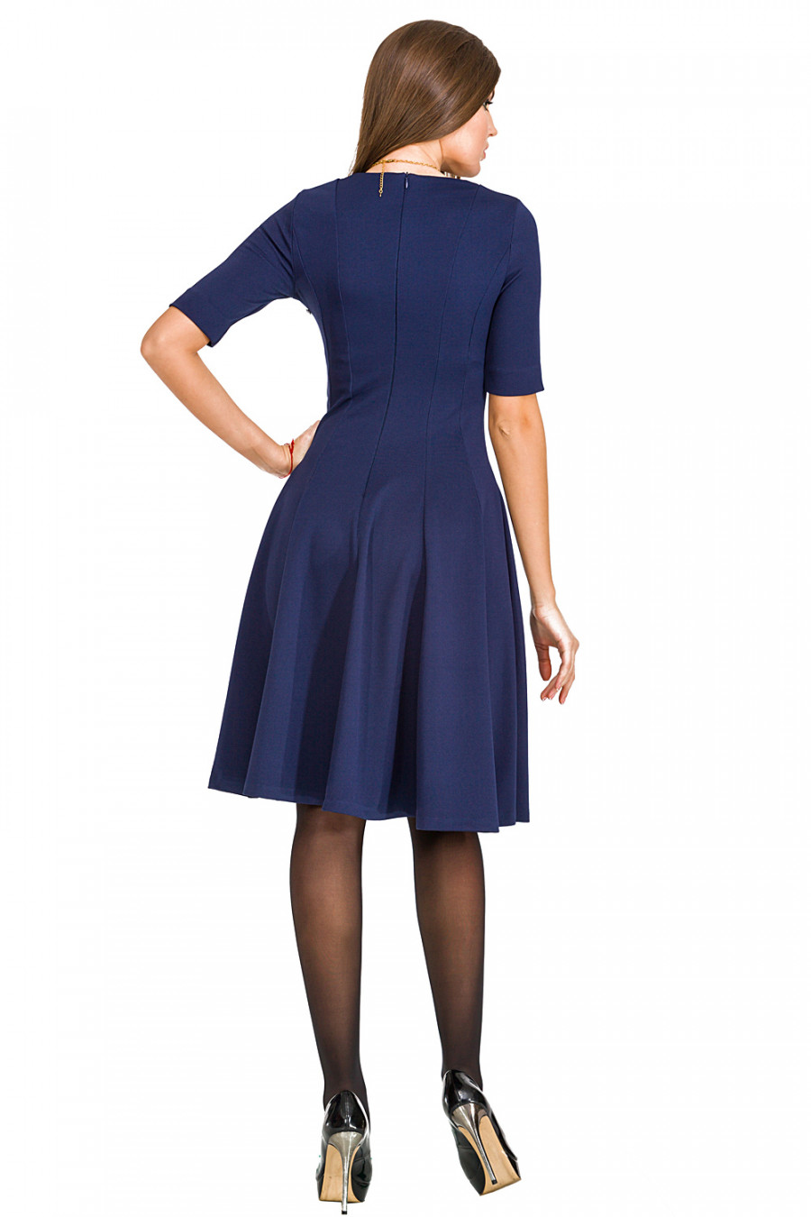 Оригинальное платье приталенного силуэта с расклешенной юбкой из клиньев. Модель с округлым вырезом горловины и рукавами 3/4. Платье выполнено из текстурного трикотажа однотонного цвета. Длина модели-ниже колена. Сзади-застёжка на потайную молнию. Прекрасный вариант для модных женщин, желающих подчеркнуть свою индивидуальность и хороший вкус.