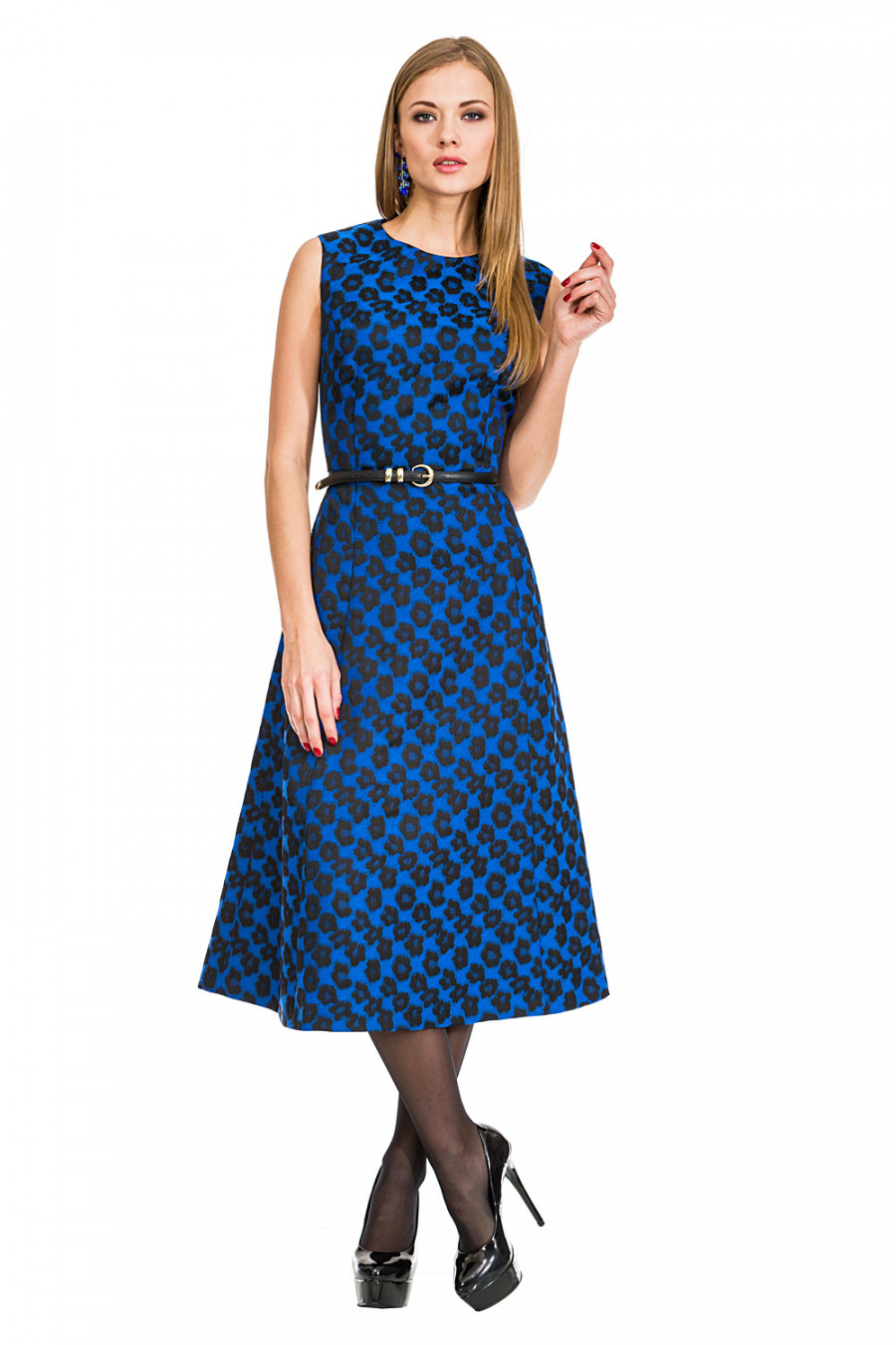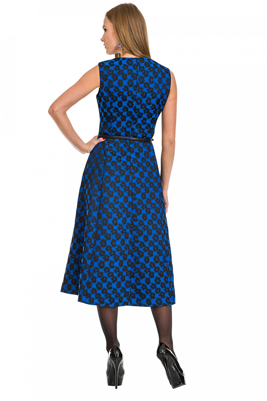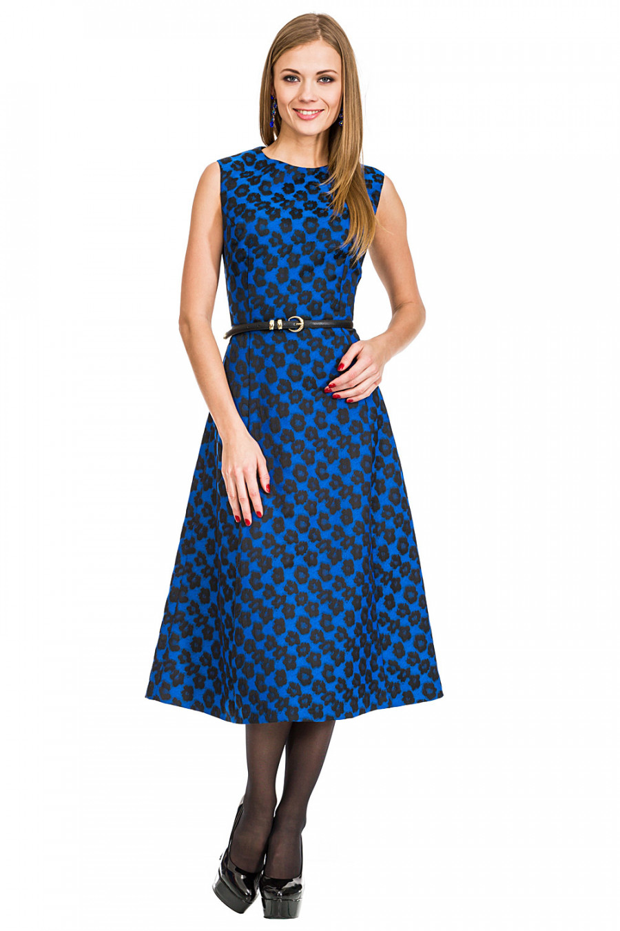 Невероятно стильное и нарядное платье. Модель универсальной длины-миди. Платье приталенного кроя без рукавов и свободной юбкой. Сзади застёжка на молнию. Отрезная талия. Платье выполнено из качественной ткани и декорировано набивным принтом в виде цветов контрастного цвета. Ткань - жаккард выглядит очень нарядно и празднично. Платье изящного силуэта создаст женственный и привлекательный образ. Модель идёт в комплекте с ремнем.