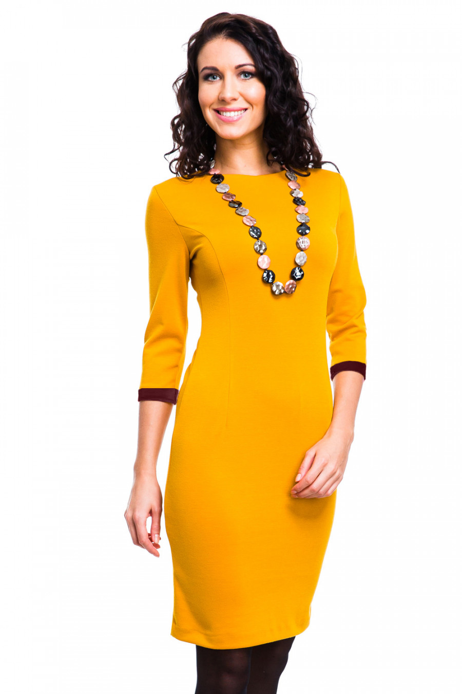Элегантное платье лаконичного дизайна с округлым вырезом горловины и рукавами 3/4. Модель приталенного кроя, длина до середины колена, без подкладки. На спинке изделия имеются потайная молния и небольшой разрез. Края манжета окантованы контрастным цветом. Бесподобный силуэт выгодно подчеркнет достоинства фигуры – воплощение безупречного вкуса. Вес за ед.: 345 г.