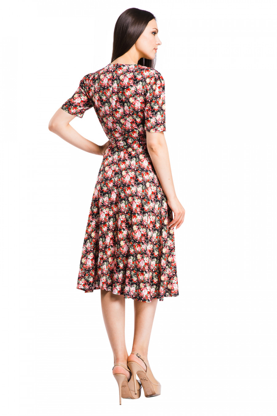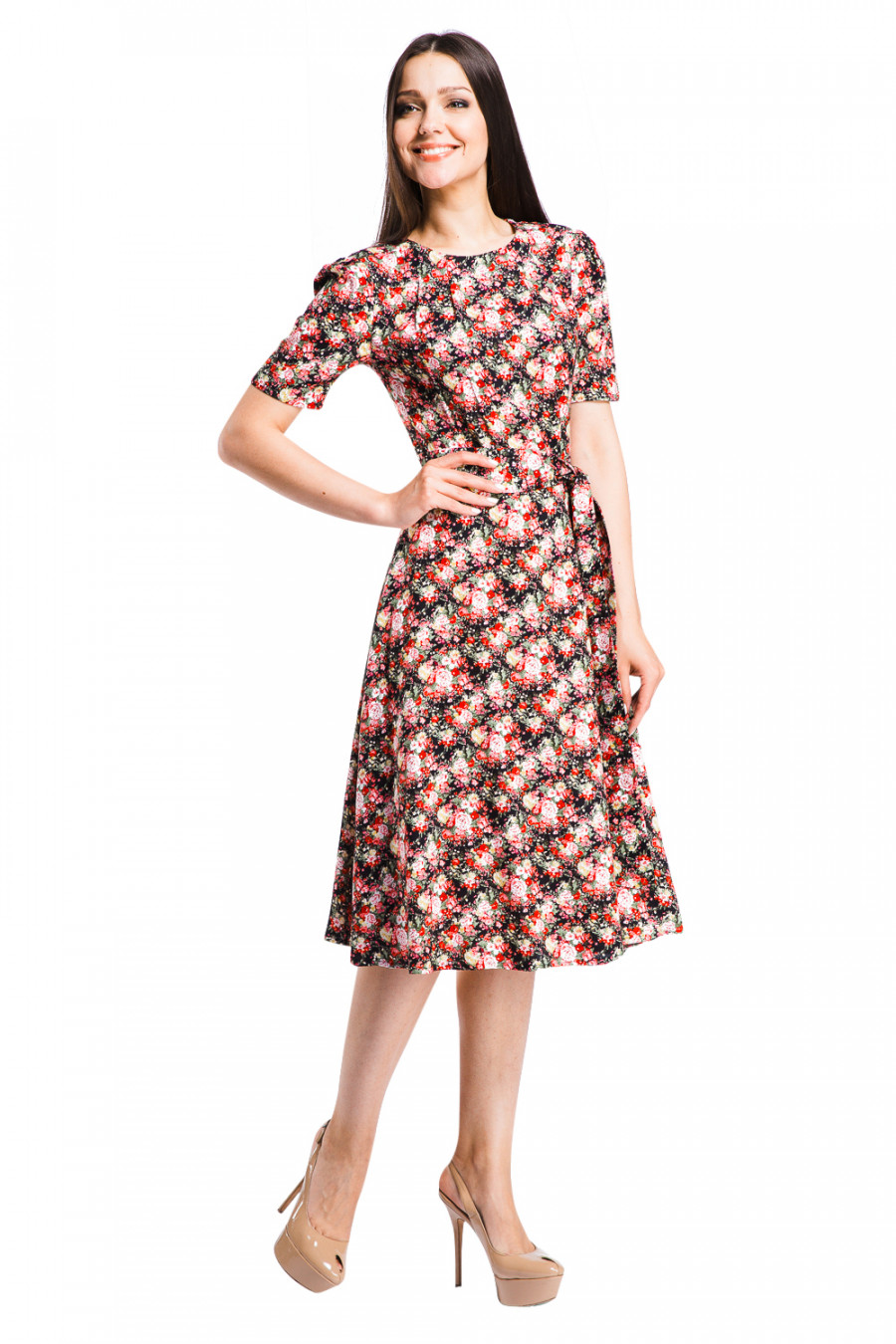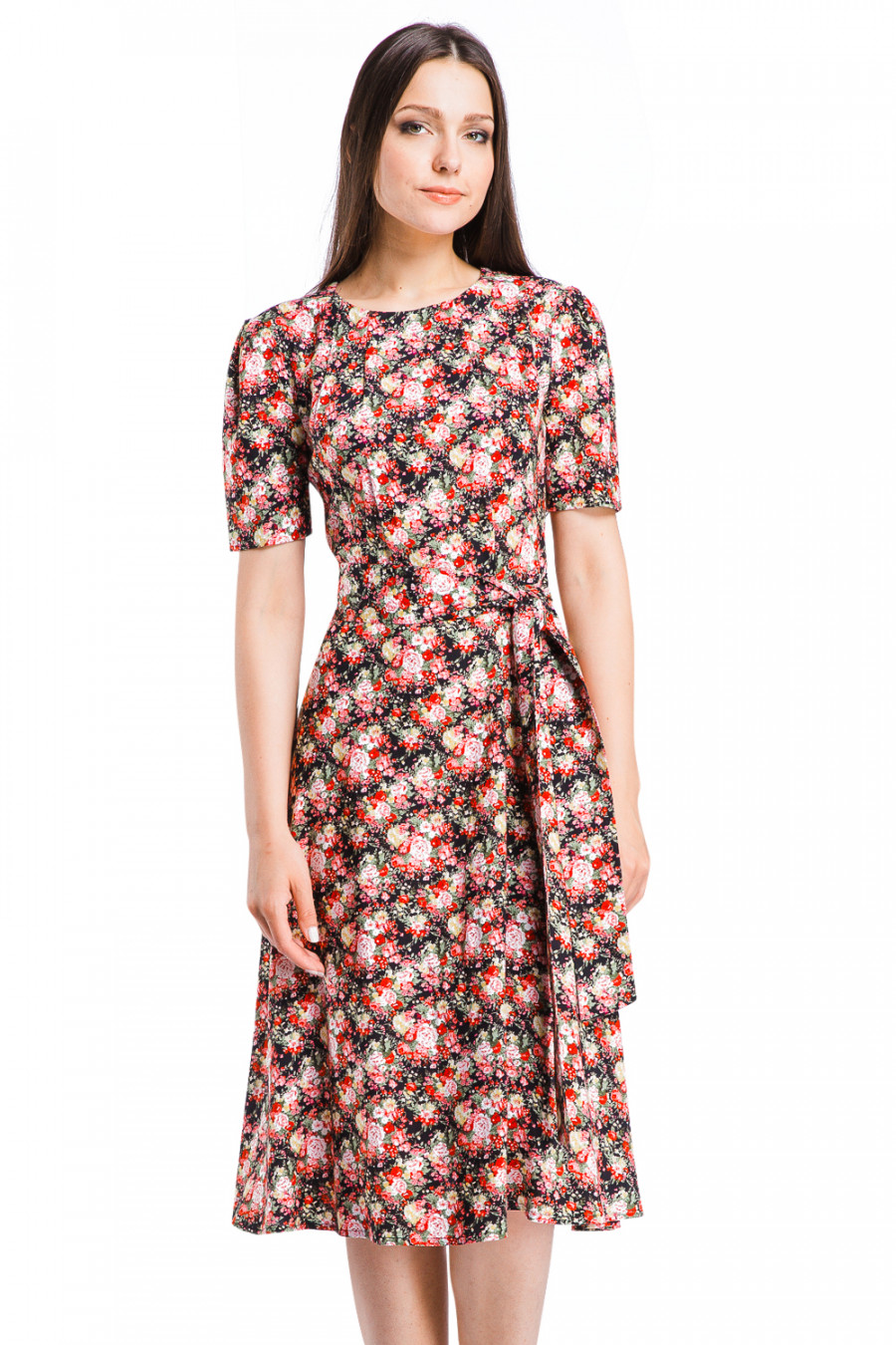 Летнее платье с округлым воротом горловины и короткими рукавами. Модель оригинального кроя и приталенного силуэта, нижняя часть-расклешенная юбка. Талия разделена тонким поясом. По линии ворота и рукавов имеются небольшие сборки. Выполнено из легкой ткани с принтом в мелкие цветы. Сзади-застёжка на молнию.